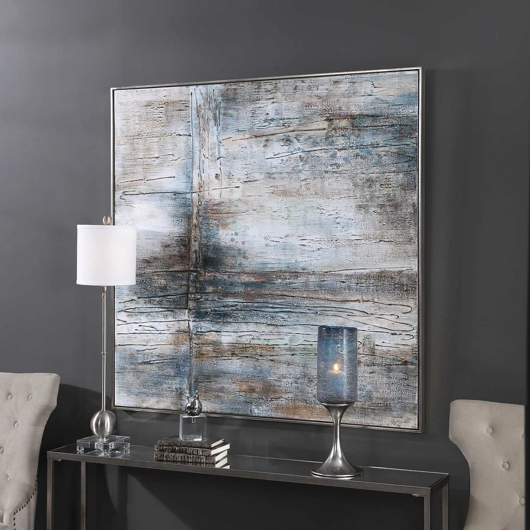 Hand painted on canvas, this abstract artwork showcases a heavily textured finish. Shades of teal, green, and light blue are accented by neutral gray, tan, and charcoal tones. An antiqued silver leaf gallery frame completes this piece.
