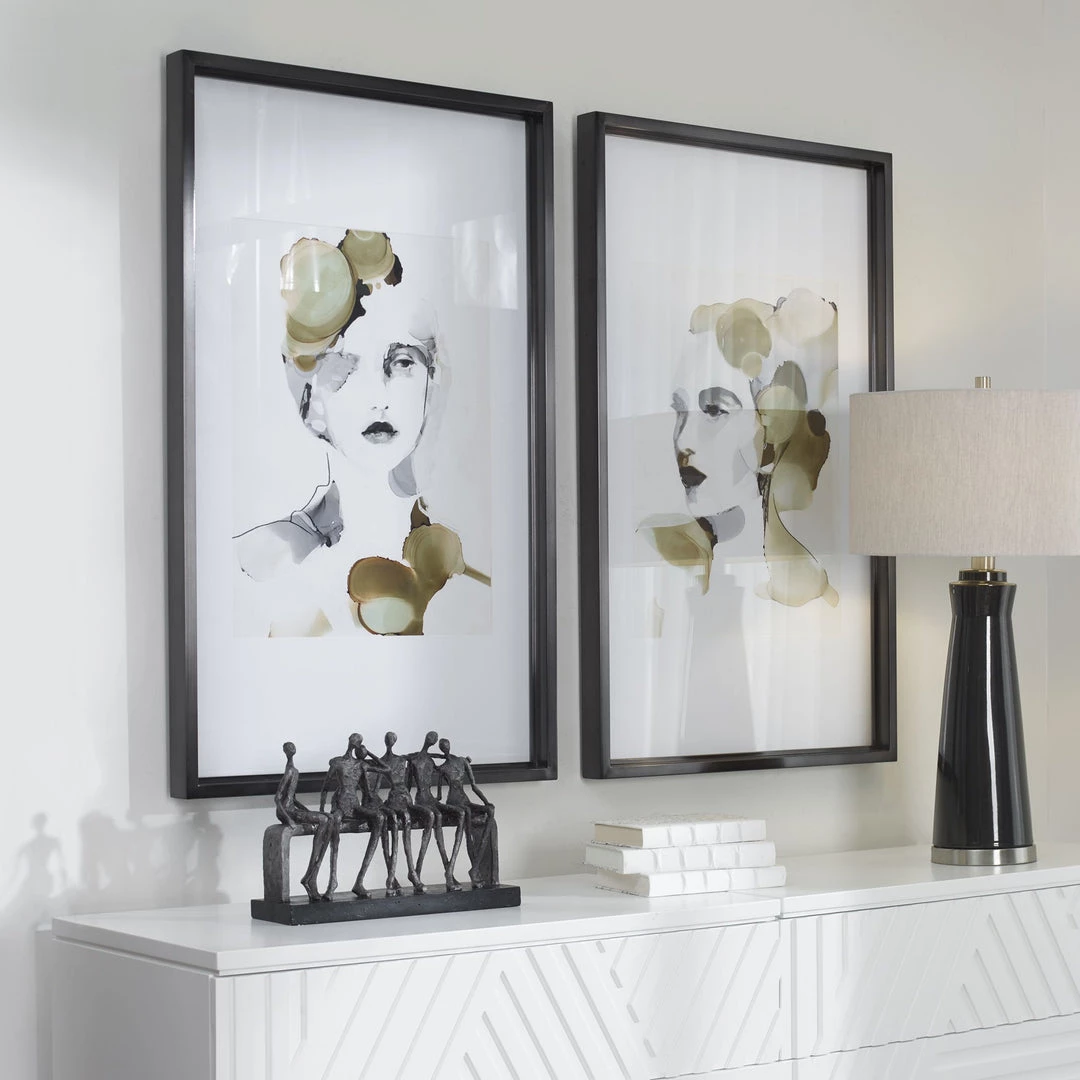 Set of two modern, statement art pieces showcase watercolor style portraits with shades of sage green, sepia, and charcoal. Each print is accented by a simple white mat with a matte black frame and is placed under glass.