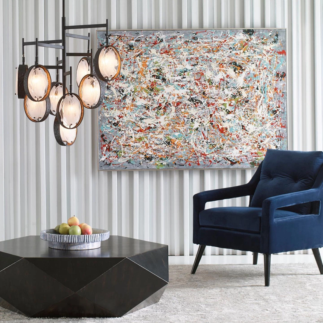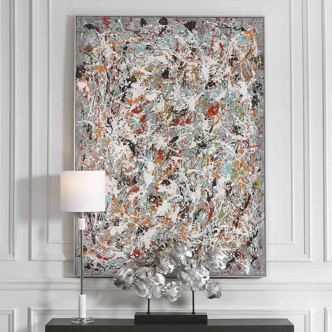 Inspired by Jackson Pollock’s famous painting style, this graphic hand painted artwork serves as a dramatic focal point for your space. The smoke gray background is highlighted by bright orange, aqua, yellow and countless other vibrant hues, accented by a sleek silver gallery frame.