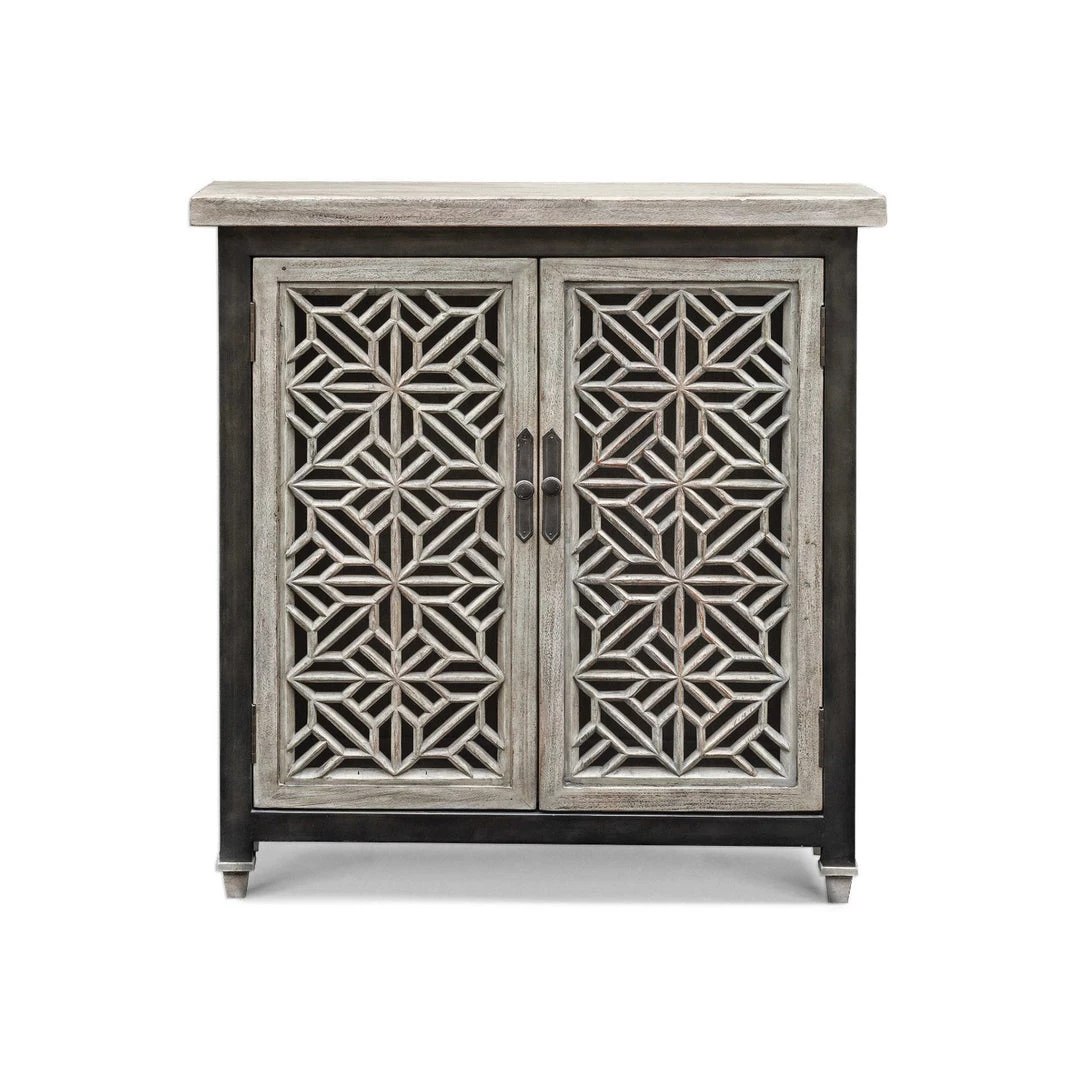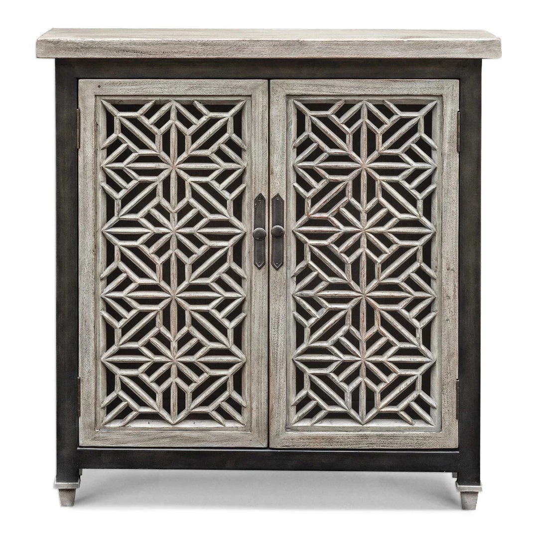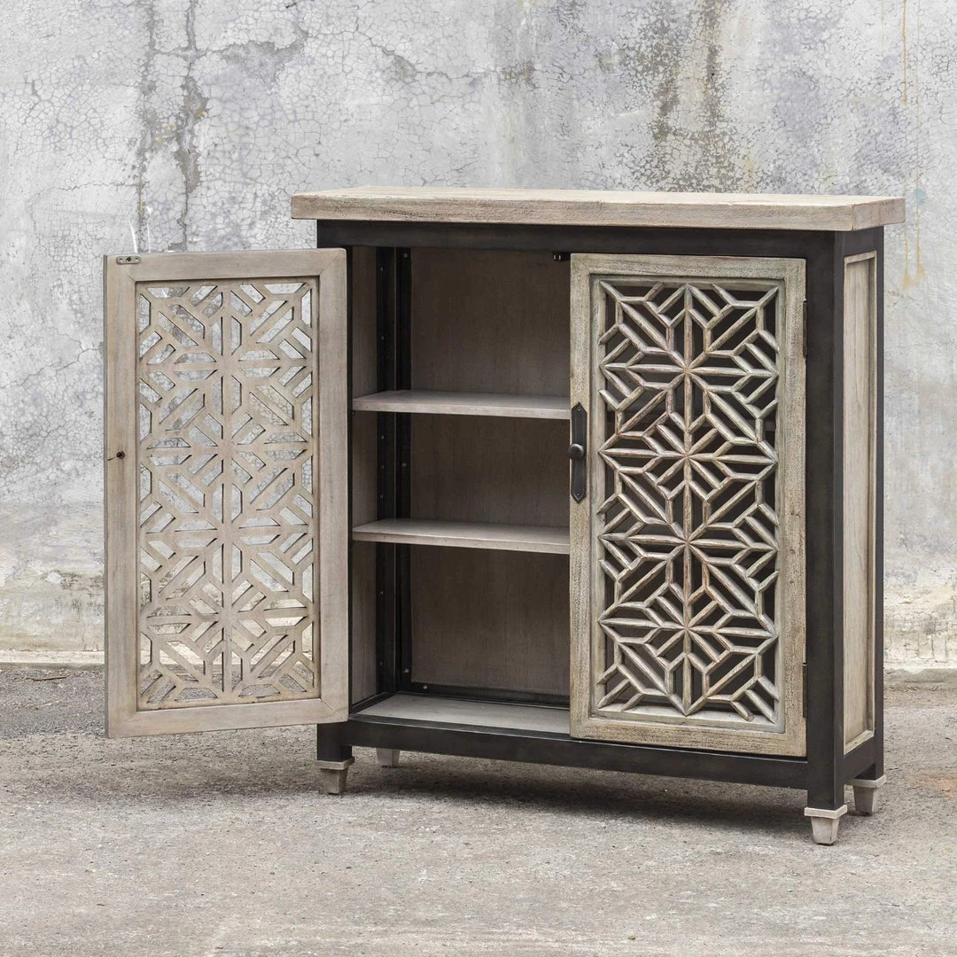 Beautifully carved open fret doors, in aged white mahogany wood with a light gray wash, framed with iron in a worn industrial finish. Two fixed interior shelves.