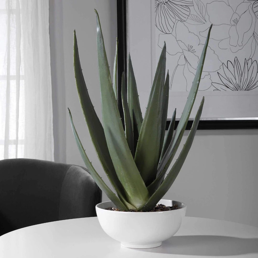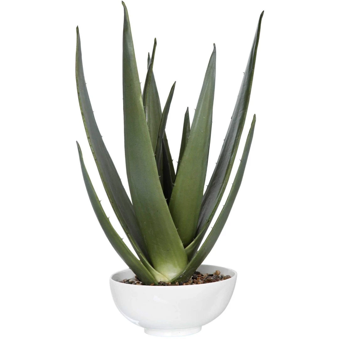 A contemporary aloe vera statement piece, accented with natural stones set into a glossy white textured bowl.