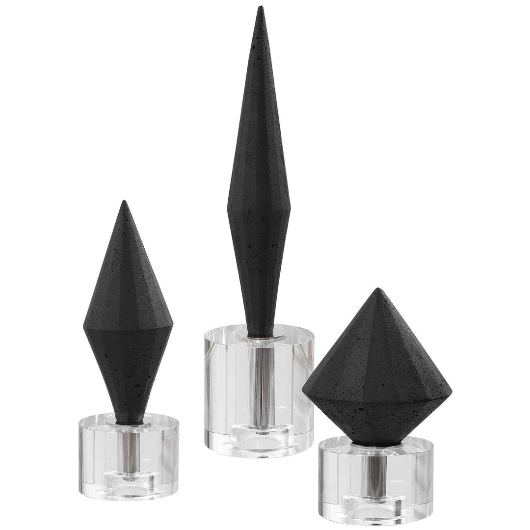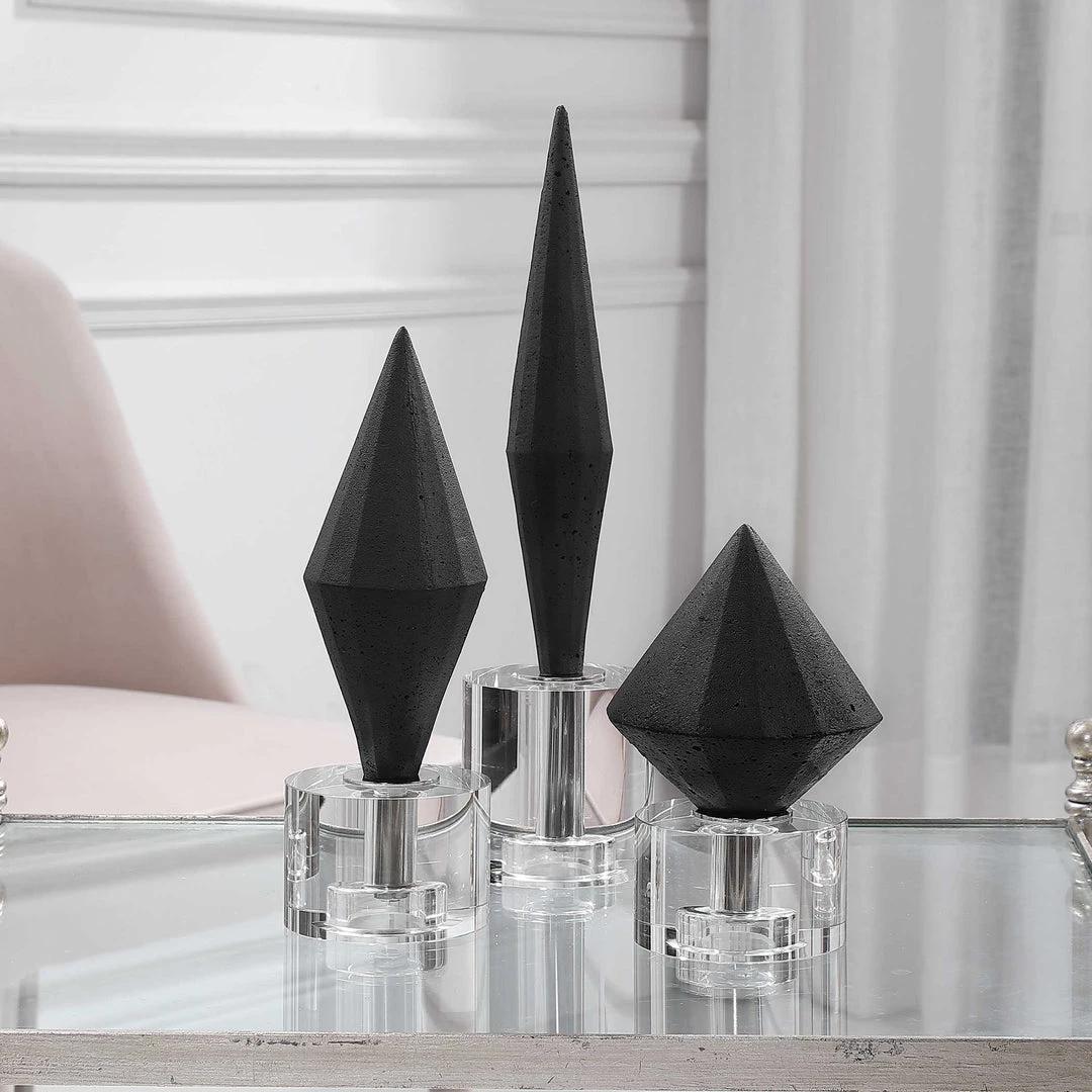 Elegant black diamonds made of granulated marble that accurately replicates the look of Thassos marble atop crystal bases.