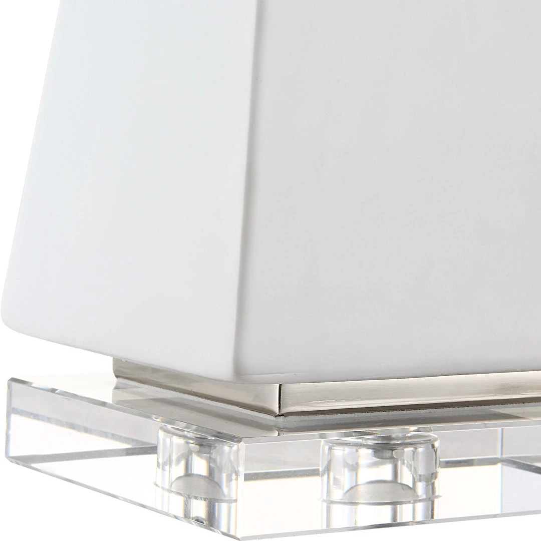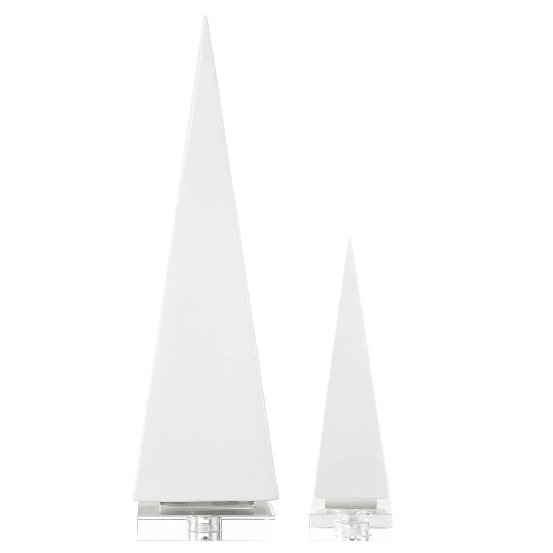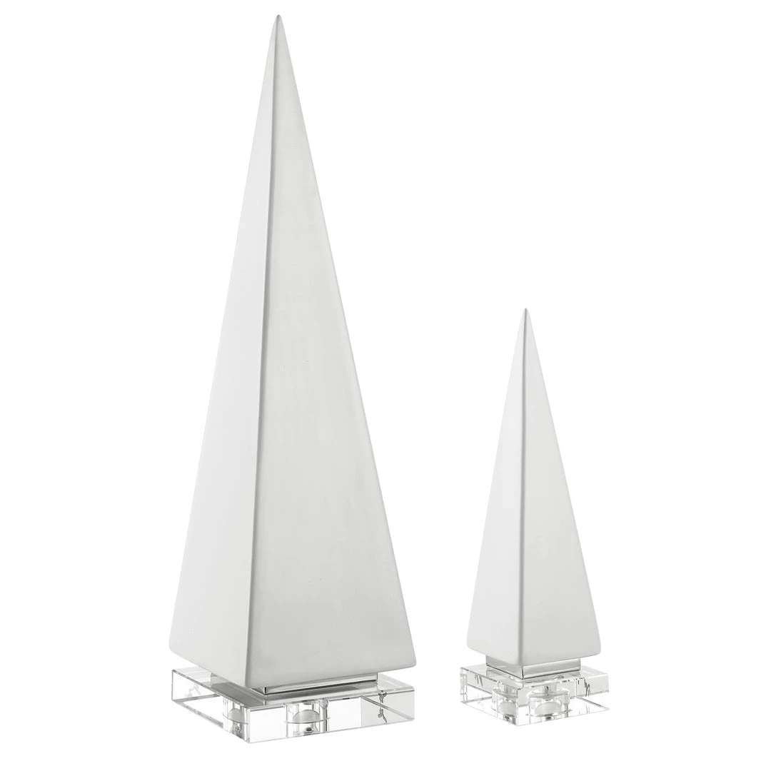 Set of two ceramic pyramid sculptures are finished in a gloss white glaze, accented by polished nickel plated bands and elegant crystal feet.