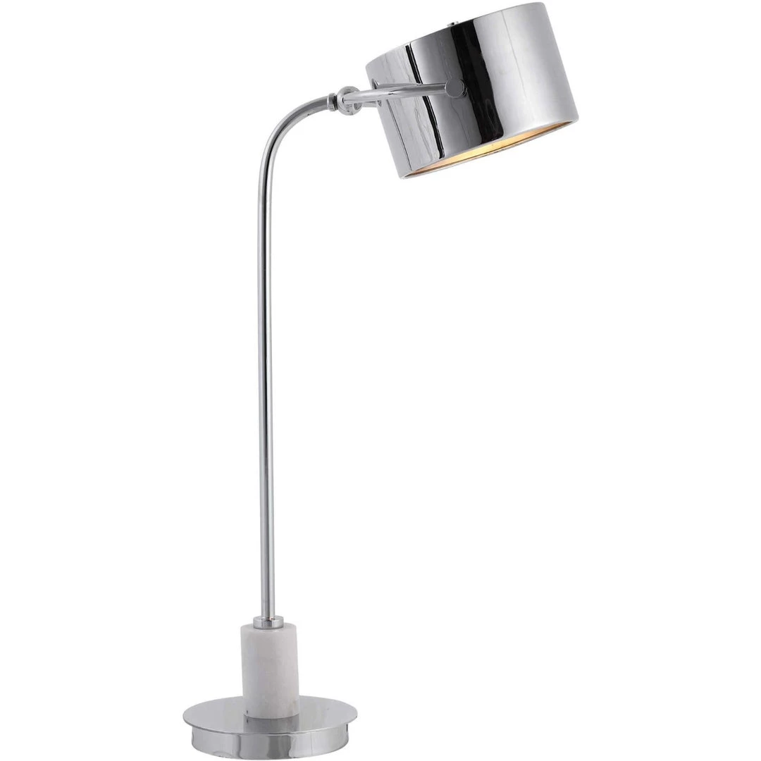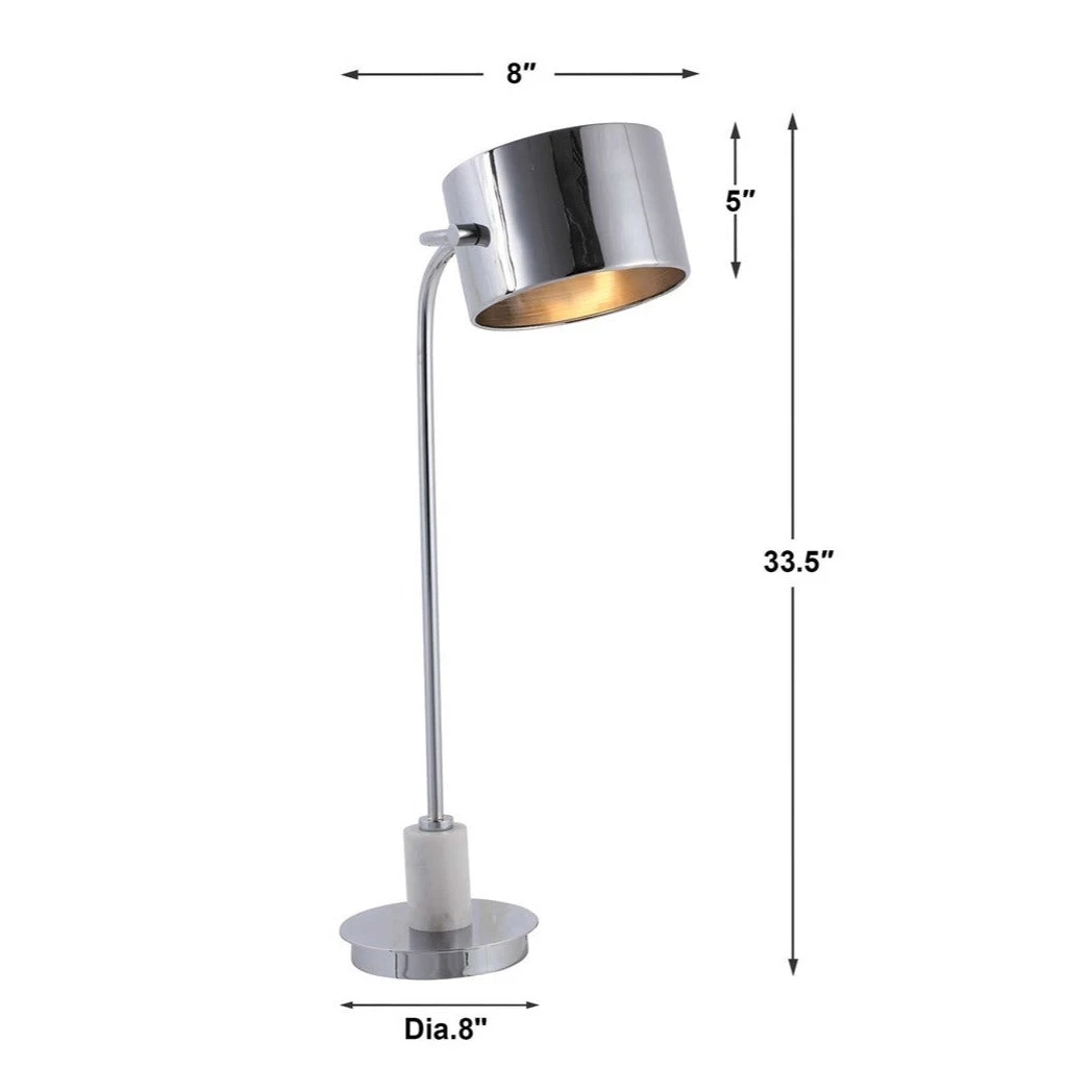 Contemporary desk lamp features a solid steel construction that’s finished in a sleek polished nickel plating with a matching metal shade, accented with a white marble collar.