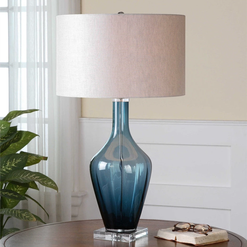 Translucent, dark azure blue glass accented with crystal details. The round hardback drum shade is a beige linen fabric with natural slubbing.