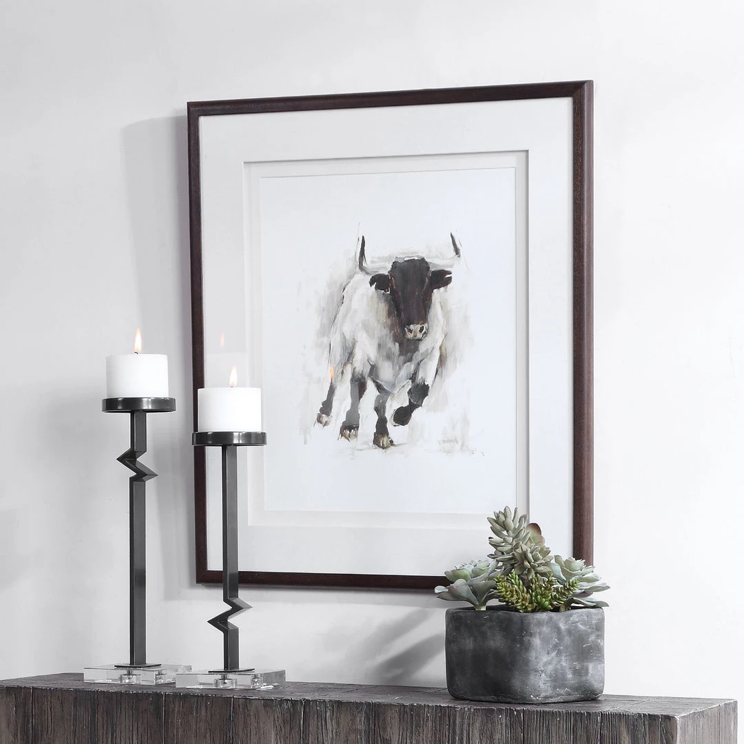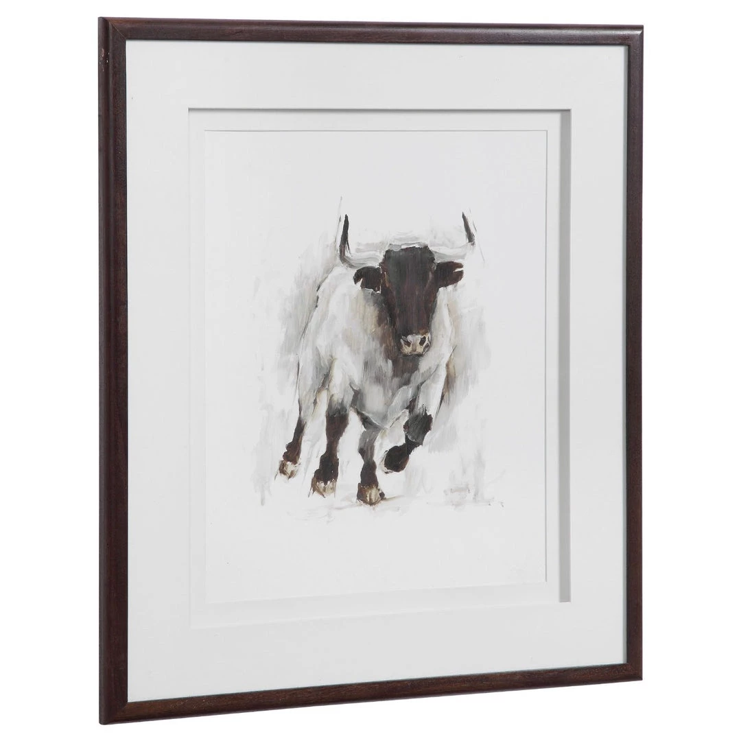 Neutral brown, white, and gray tones are used in this modern lodge style framed print. The print is complemented by double white matting with a simple wood frame and is placed under glass.