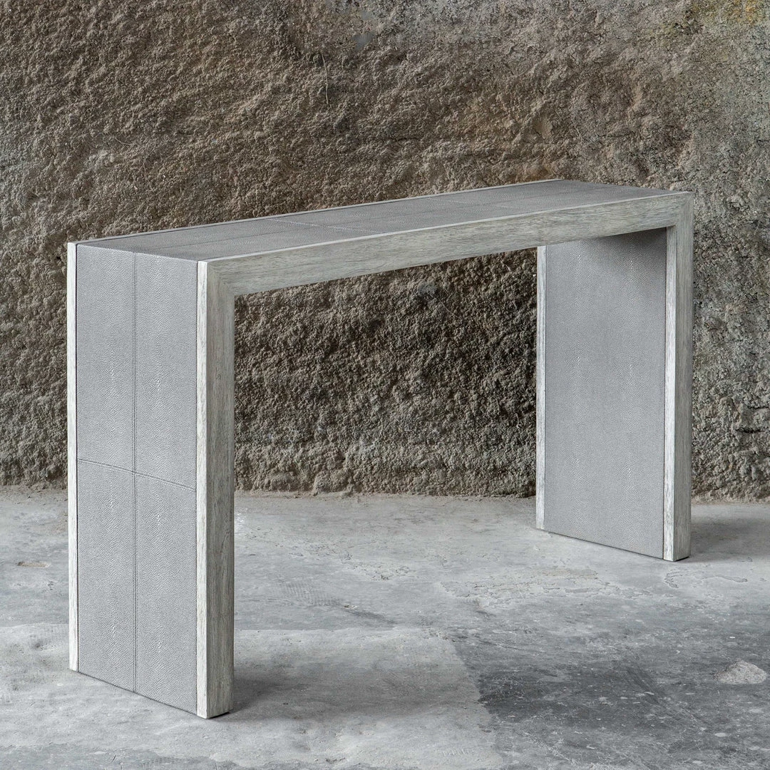 With modern elements, this rustic console features stitched panels of light gray faux shagreen, paired with a contrasting wood finish in a aged white with gray distressed details.