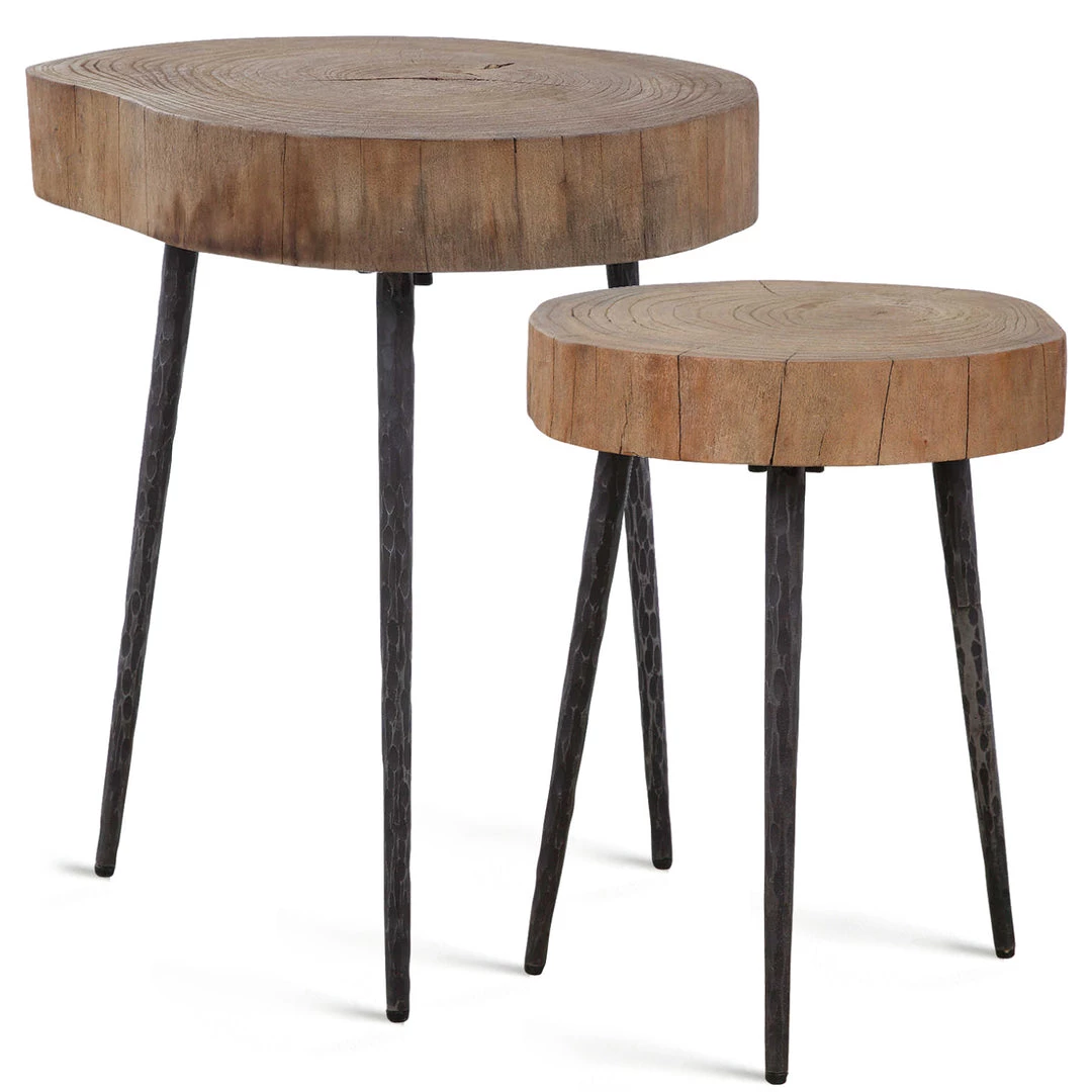 Perfectly modern with organic appeal. These tables feature thick slabs of cross cut reclaimed elm wood set atop cast iron legs finished in aged steel with chiseled texturing.