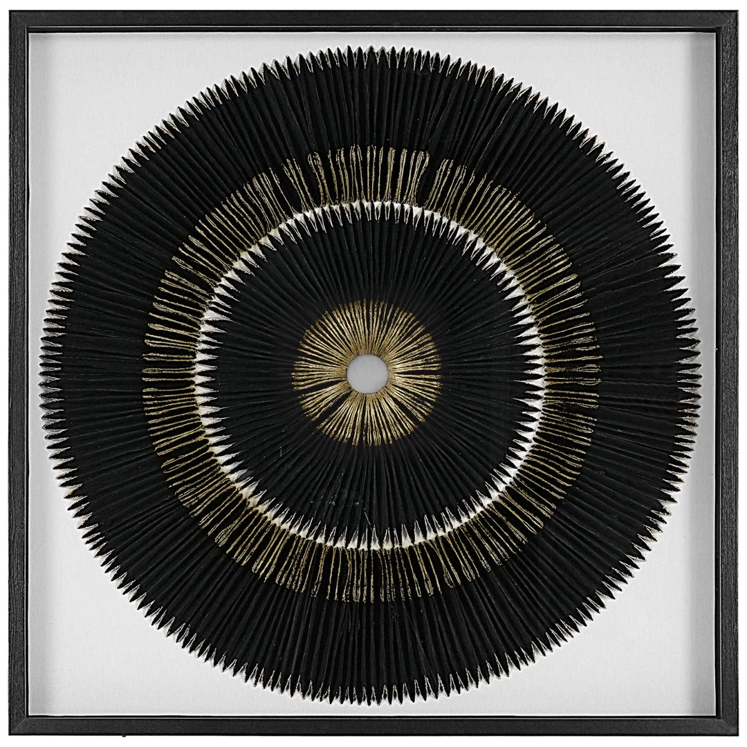 Handcrafted by skilled artisans, this wall decor features a striking black and gold leaf medallion. Artwork is set against a white linen backing in a black shadowbox style pine wood frame under glass.