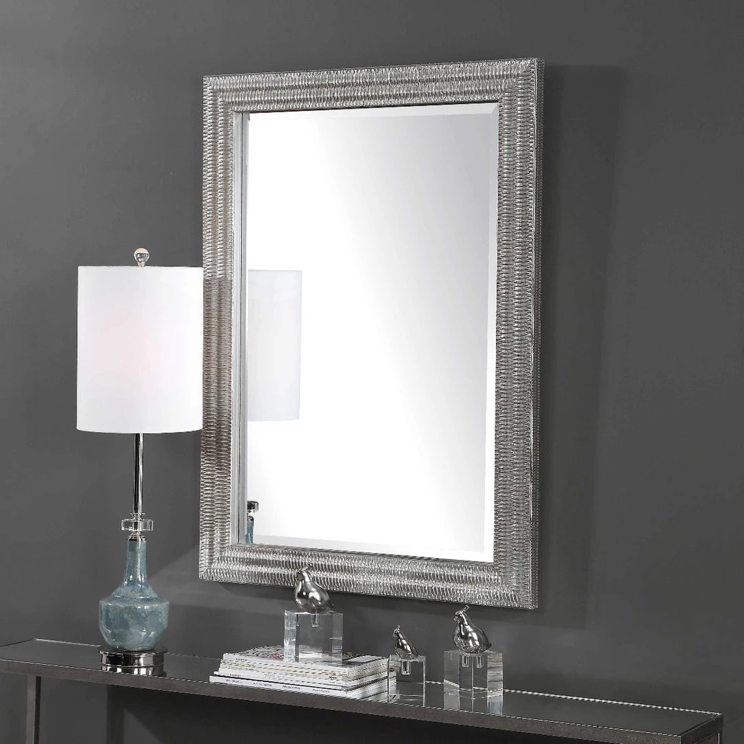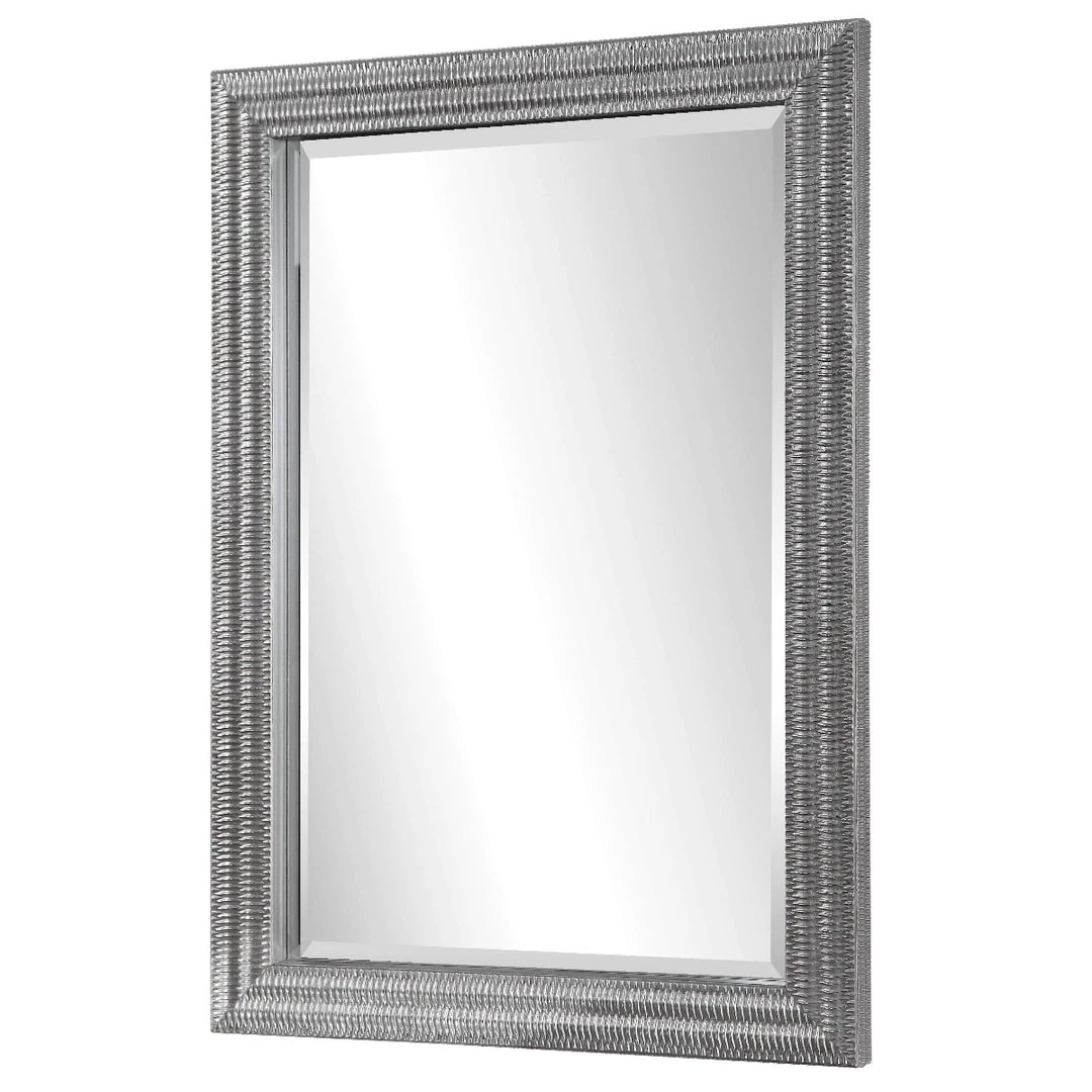 This mirror is finished in silver leaf with woven texture that adds visual interest. The mirror has a 1″ bevel and may be hung horizontal or vertical.