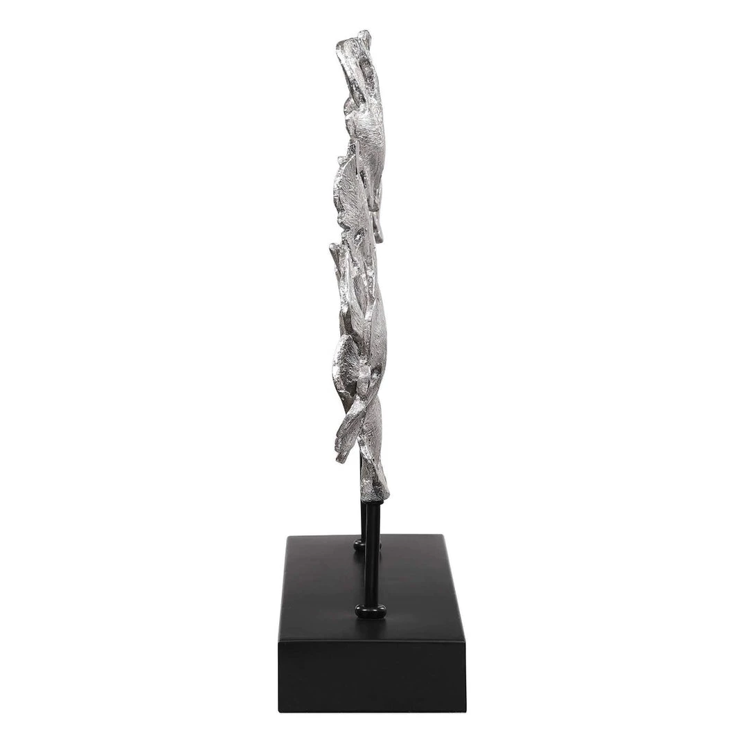 Inspired by lotus flowers, this sculpture is finished in a contemporary silver leaf with noticeable texture and distressed details. The piece is supported by an iron foot finished in matte black.