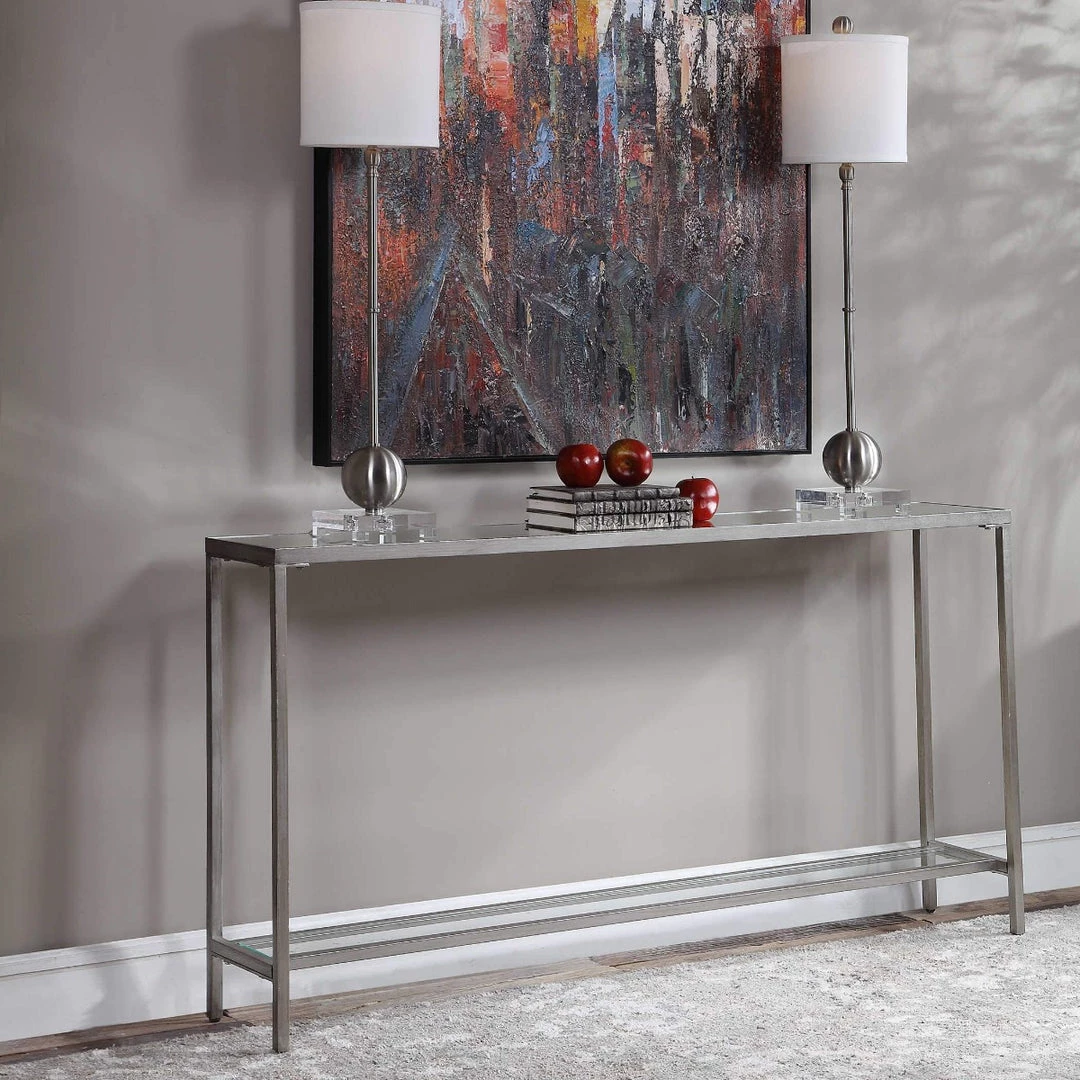 Classic minimalism, this narrow iron console table is finished with lightly antiqued silver leaf, inset with a beveled mirrored top, and gallery shelf in clear glass.
