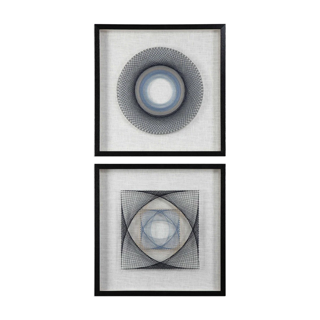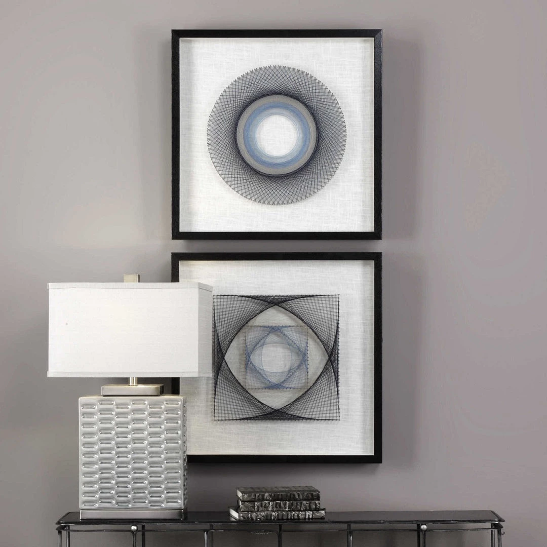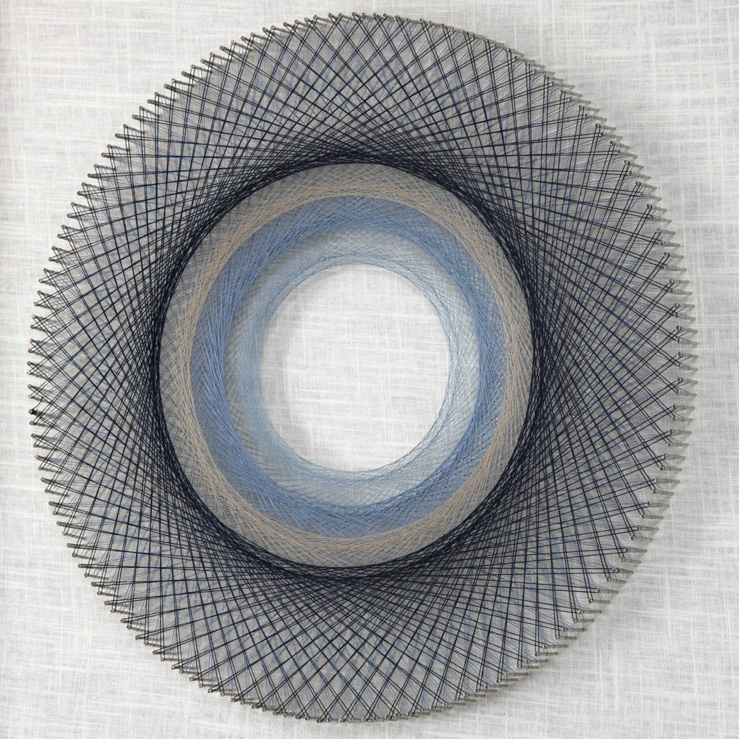 These fun shadow boxes feature 3-dimensional layered string art, hand threaded around individually hammered pin nails in easy shades of blue, over a neutral linen backing with a black pine frame.