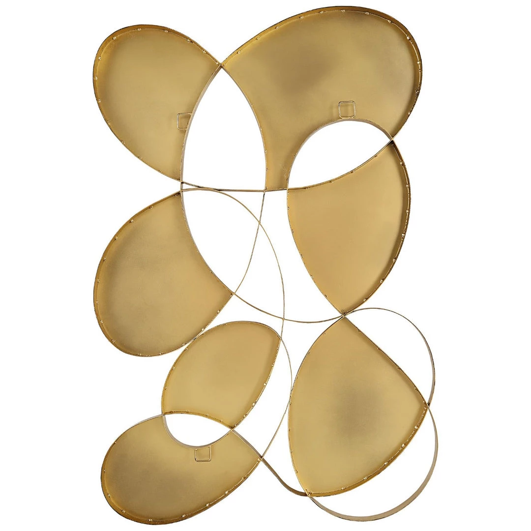 Contemporary wall panel showcases an elegant curved silhouette featuring a solid iron frame finished in gold leaf, accented by back-painted white glass accents.