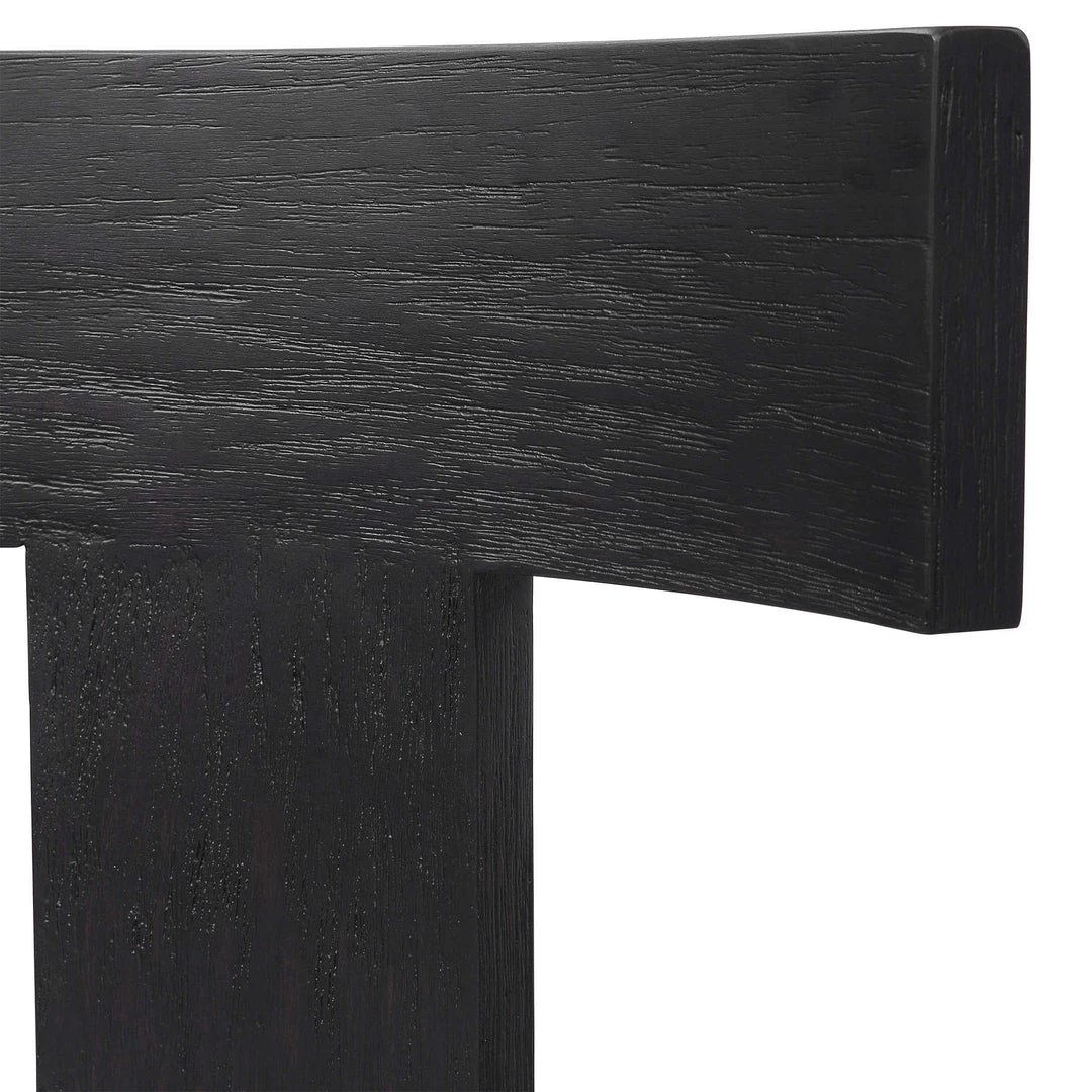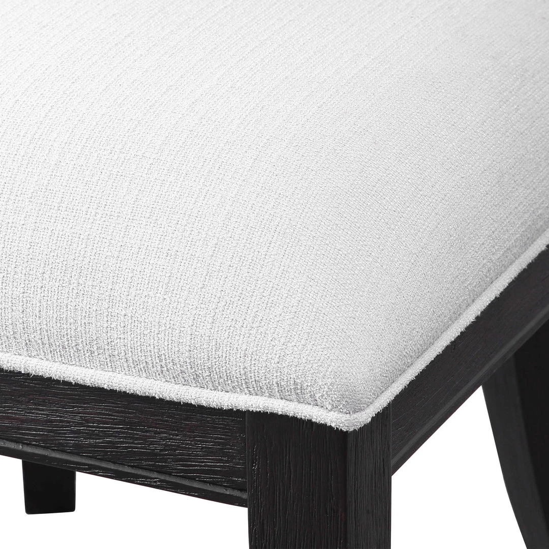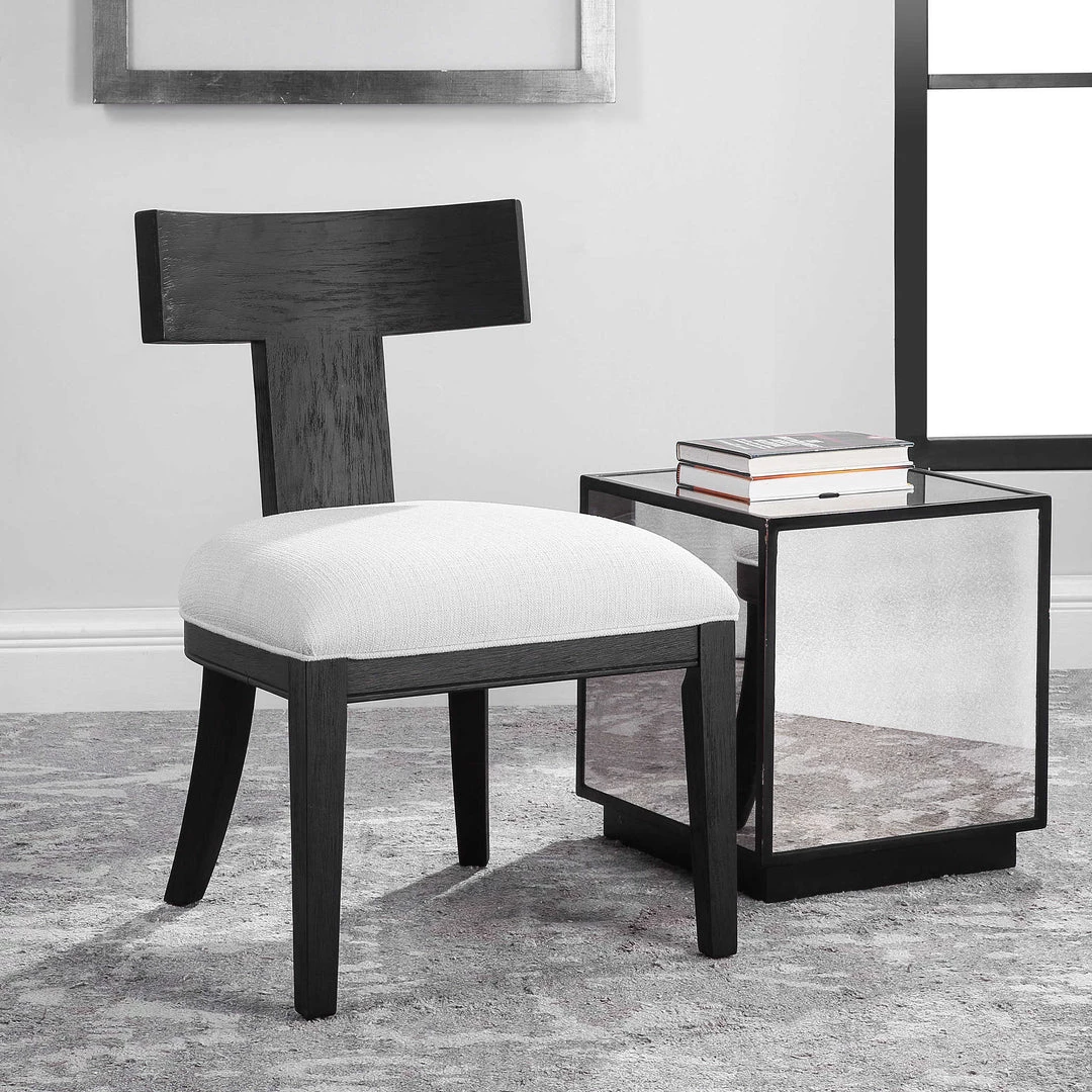 A casual take on a classic design, this klismos style chair features a curved rubber wood frame that has been wire brushed and rubbed in a charcoal black stain, paired with a white slubbed performance fabric cushion.