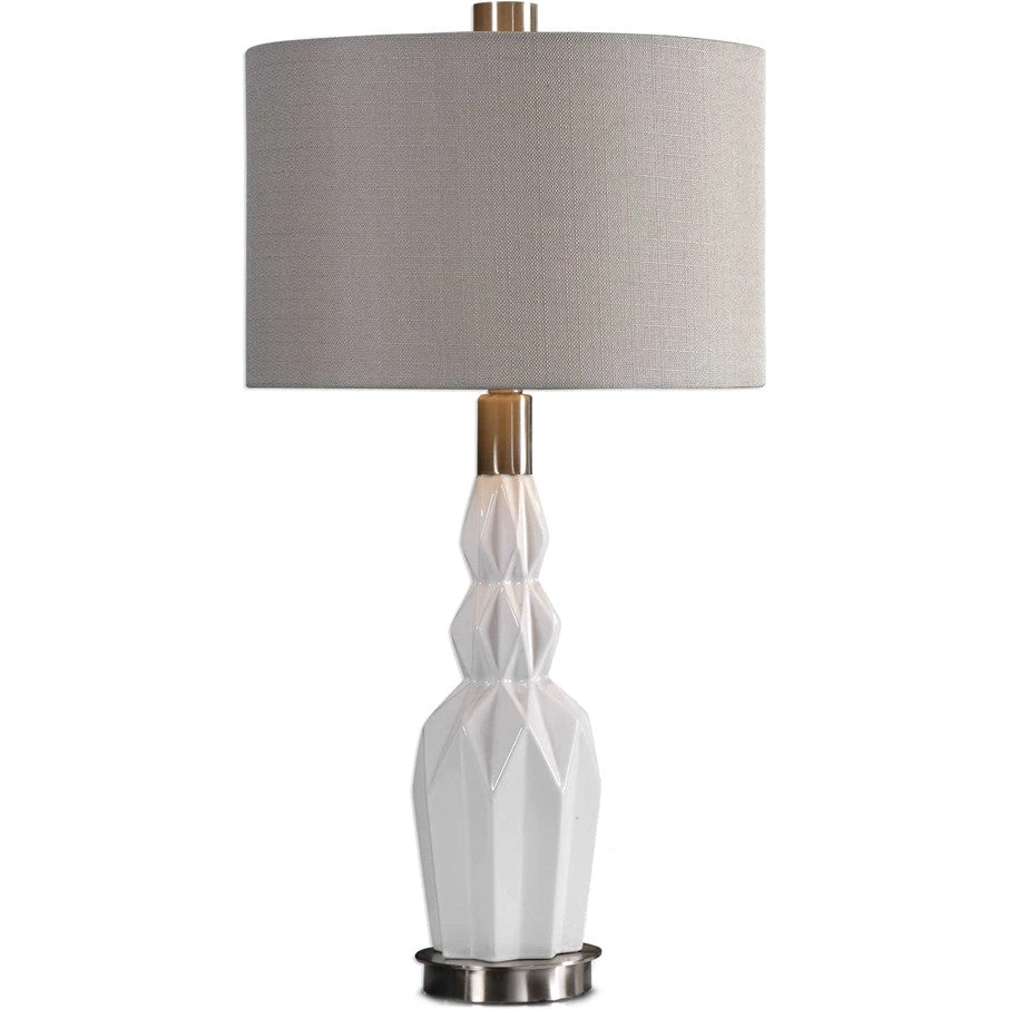 Gloss white ceramic with deeply embossed diamond features, accented with brushed nickel plated details. The round hardback drum shade is a beige linen fabric with natural slubbing.
