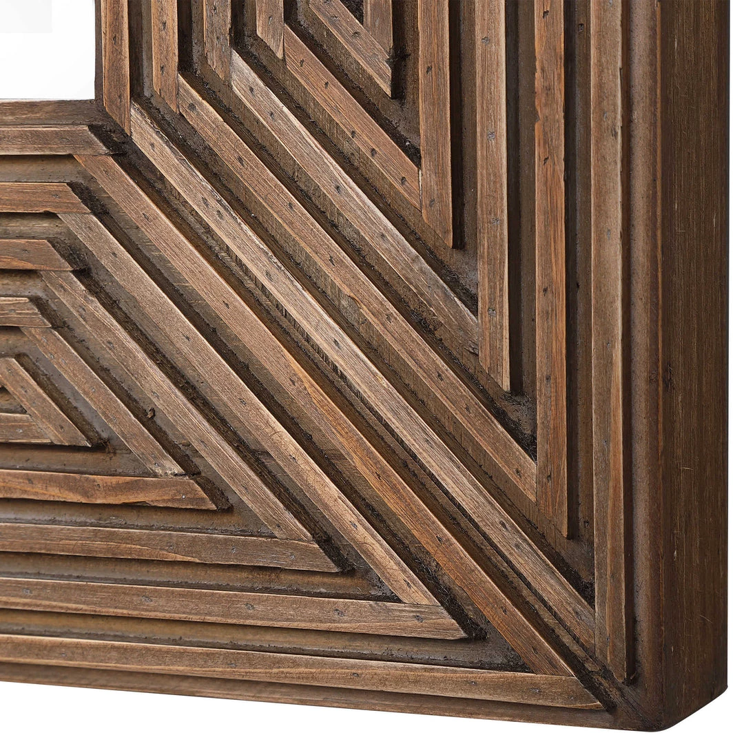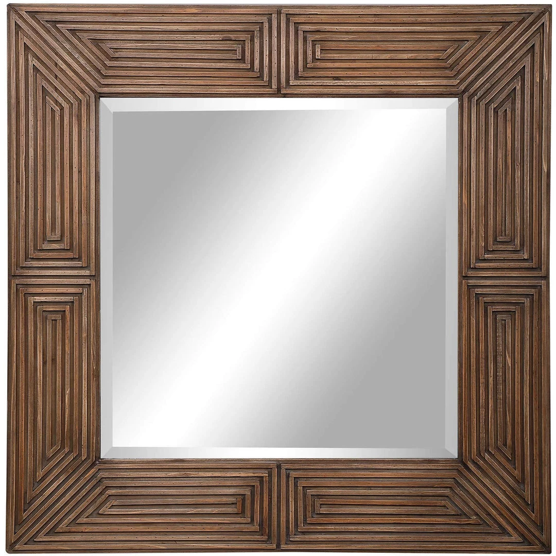 Inspired by world travels and collected pieces, this square mirror showcases intricate hand carved details that create unique geometric patterns. The aged chestnut stain finished frame highlights a beveled center mirror.