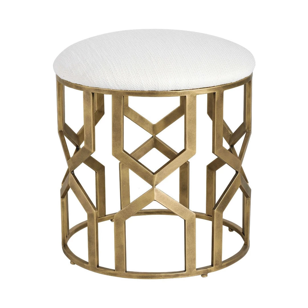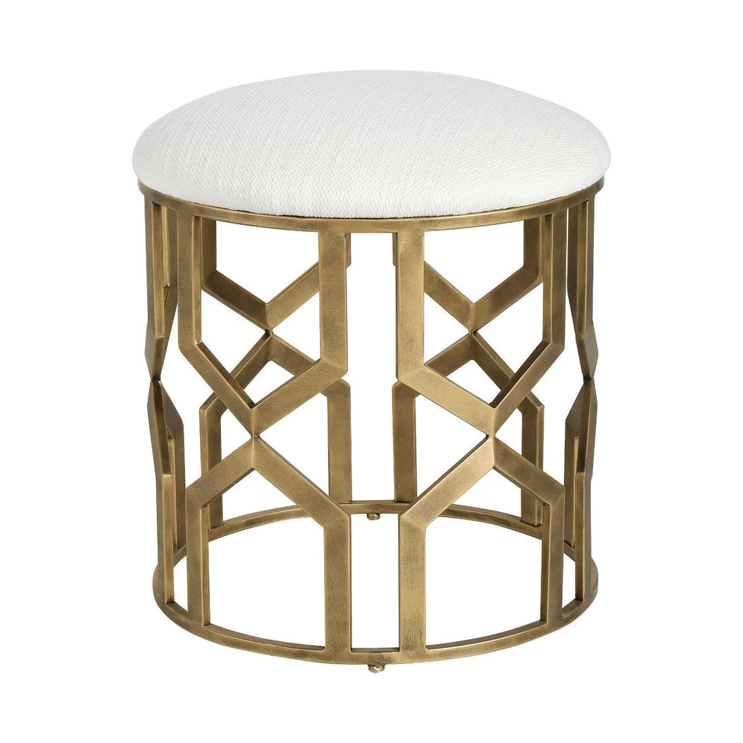 Stylish and versatile, this round accent stool showcases a solid iron base with a modern geometric motif finished in antique brushed brass. The cushioned top is upholstered in a crisp white textured fabric, doubling its use as a seat or footrest.
