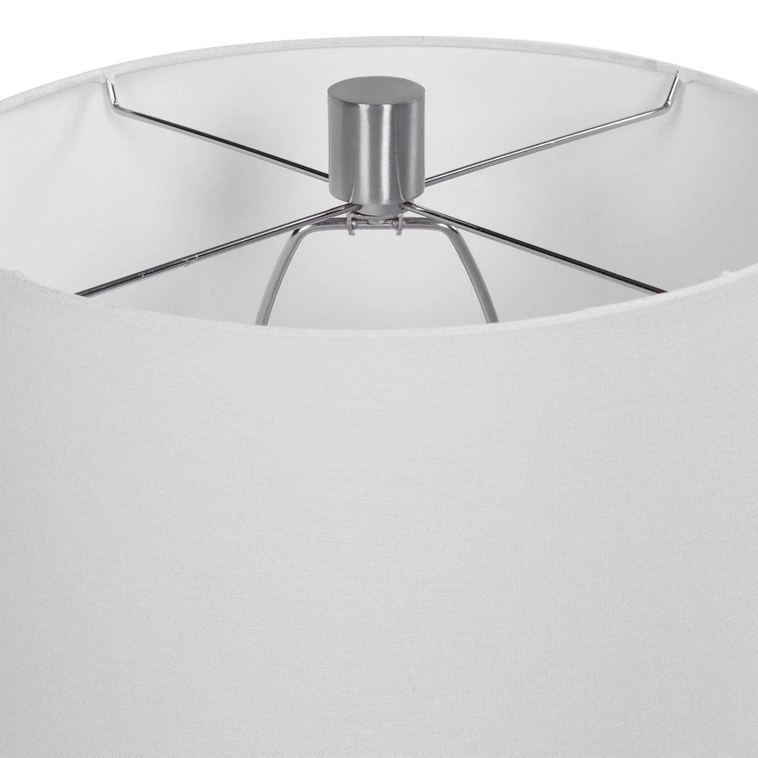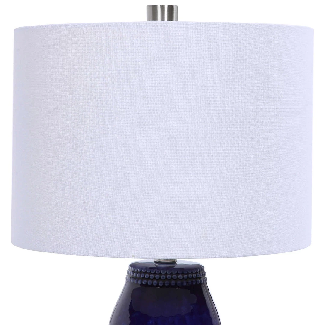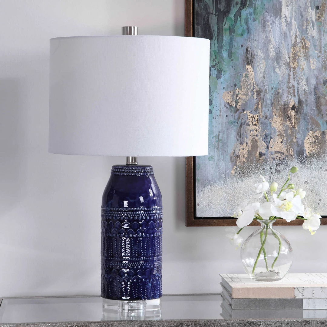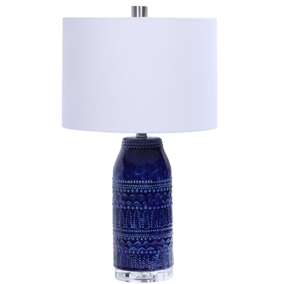 This ceramic table lamp is finished in a distressed deep blue glaze features an embossed tribal design displayed on a thick crystal foot accented with brushed nickel details. The lamp is complimented by a white fabric drum shade.