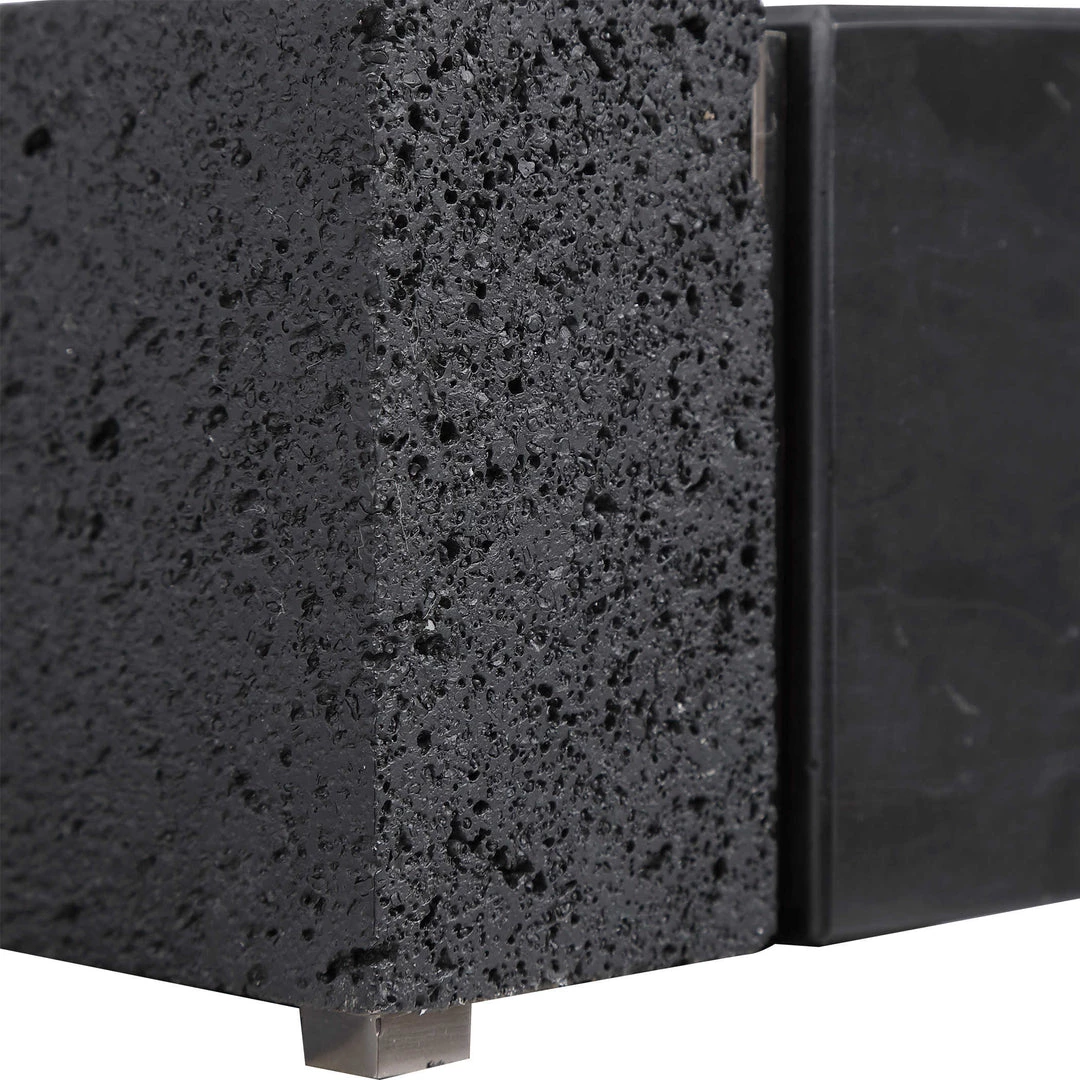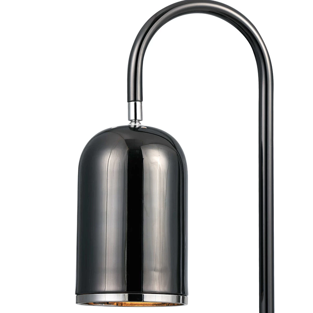 Contemporary style desk lamp showcases a sleek steel base finished in a plated black nickel with a matching metal shade and polished nickel accents. The block foot is a combination of black lava stone and black marble with subtle white veining and beveled edges.