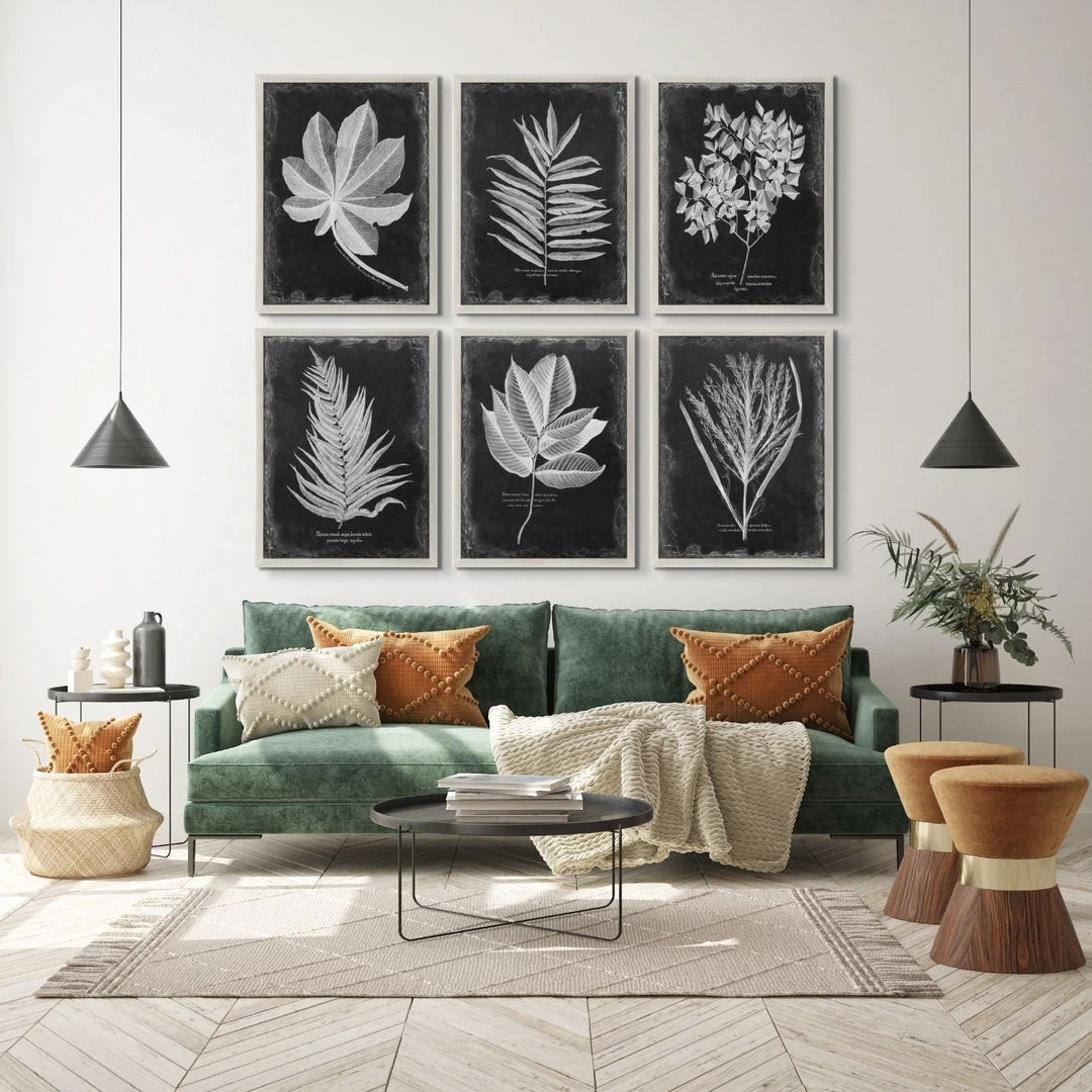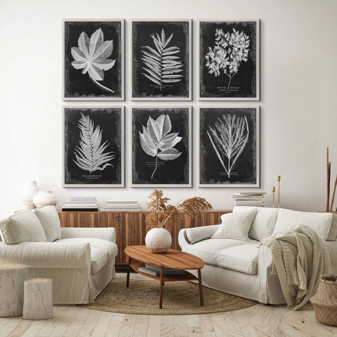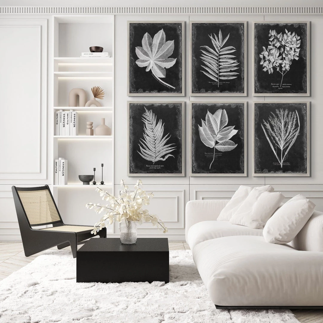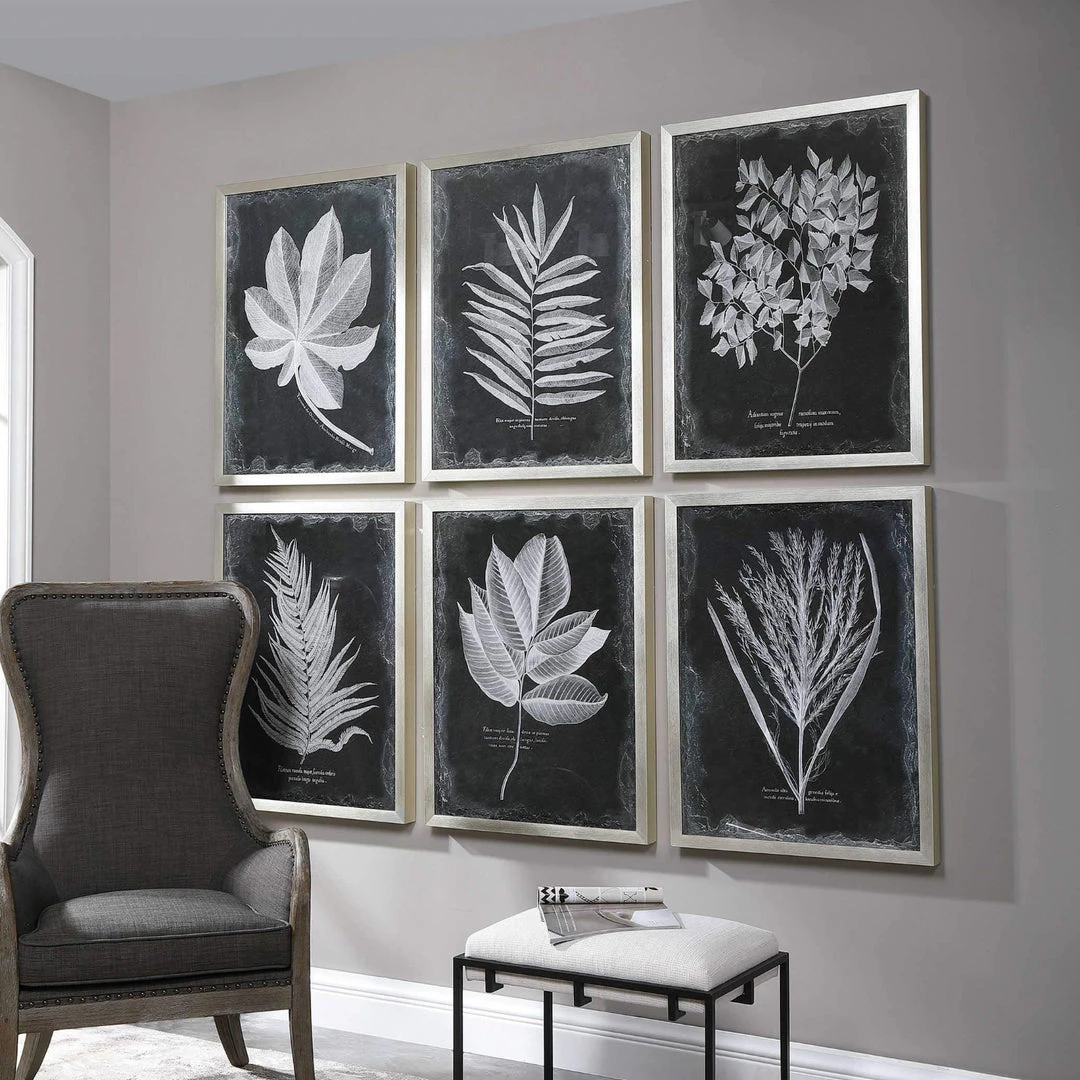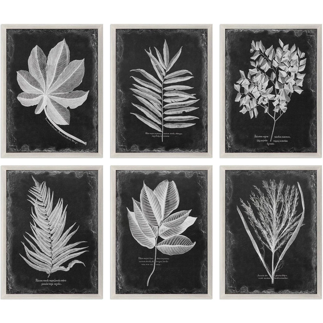This botanical artwork showcases vintage style with a contemporary edge. Each striking black and white contrast is accented with a petite, champagne silver frame. Each print is placed under protective glass.