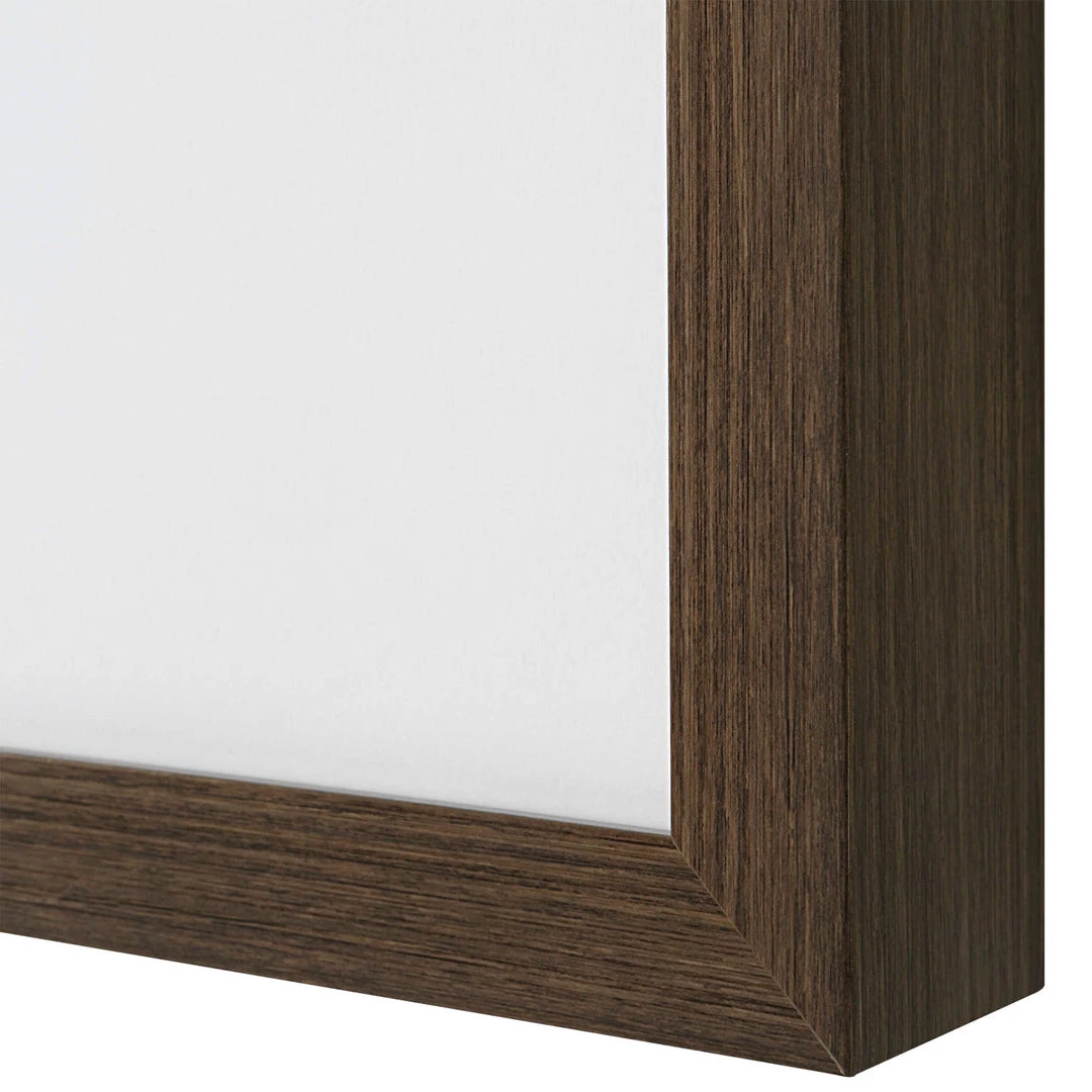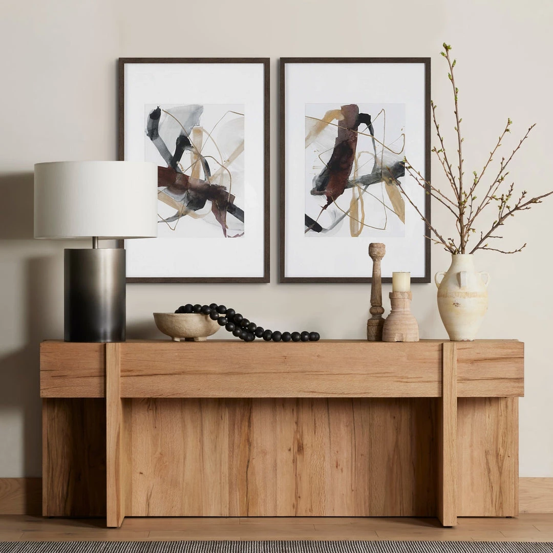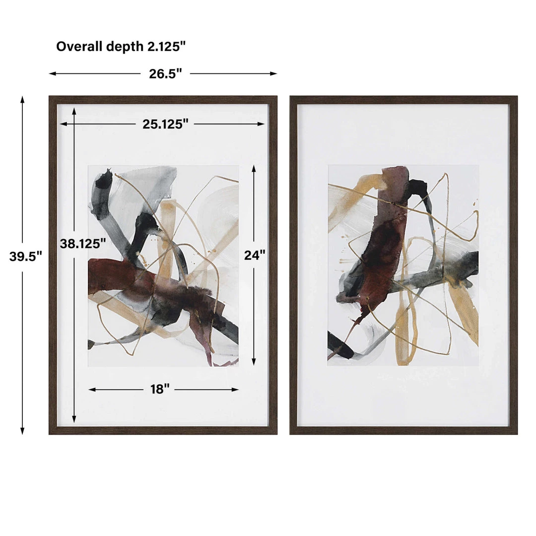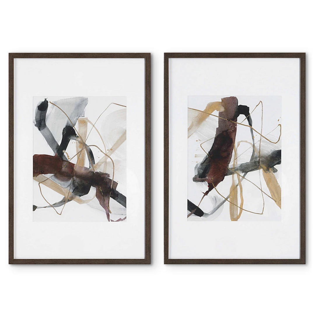 This abstract artwork displays a harmonious blend of neutral brushstrokes in gray, black, and warm chestnut tones. Each print is accented by a white mat under glass with a dark walnut finished frame.