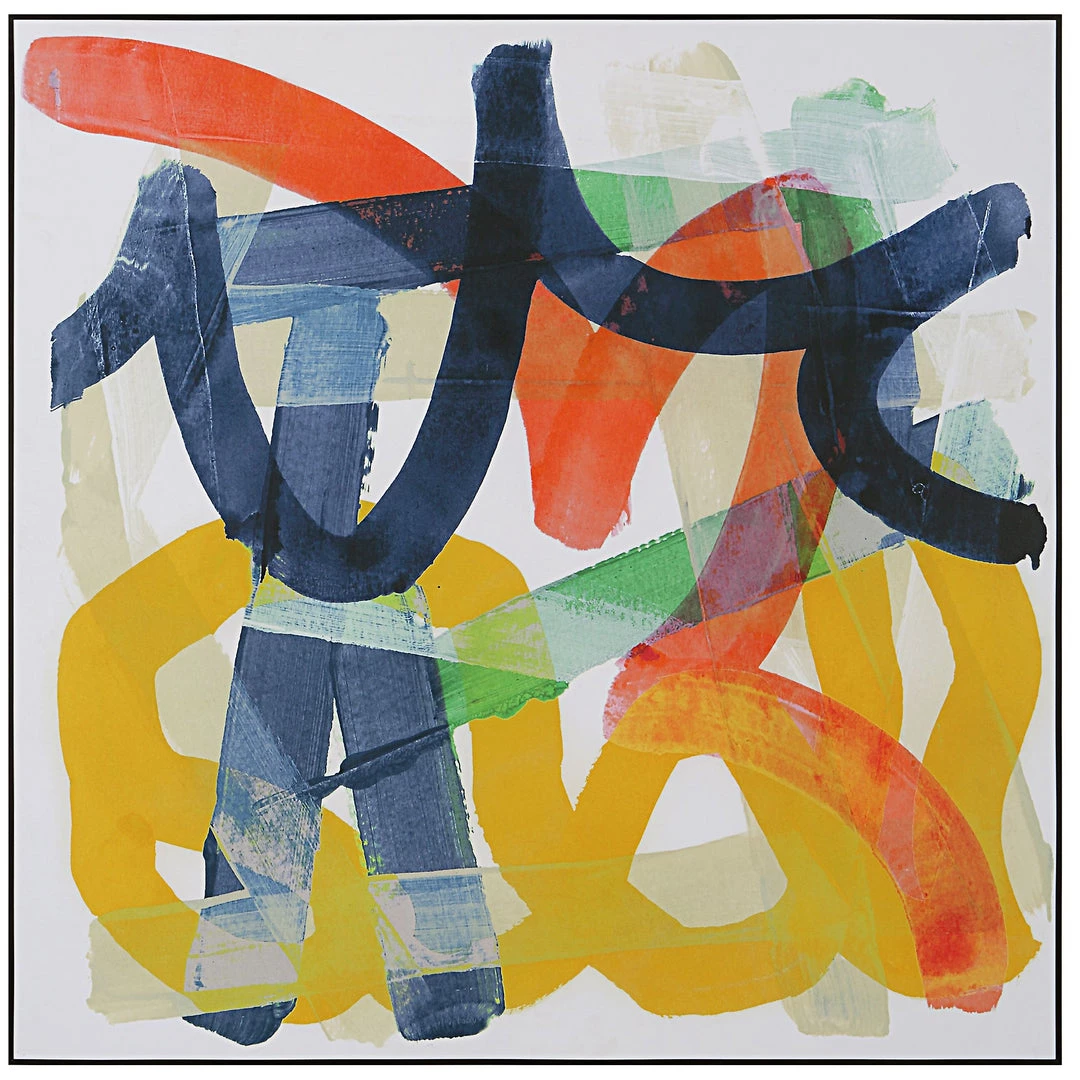 This framed graffiti print is a true work of modern art. The print displays a multitude of abstract channels in bright pops of mustard, lime, navy, and denim accented by a petite jet black metal frame.