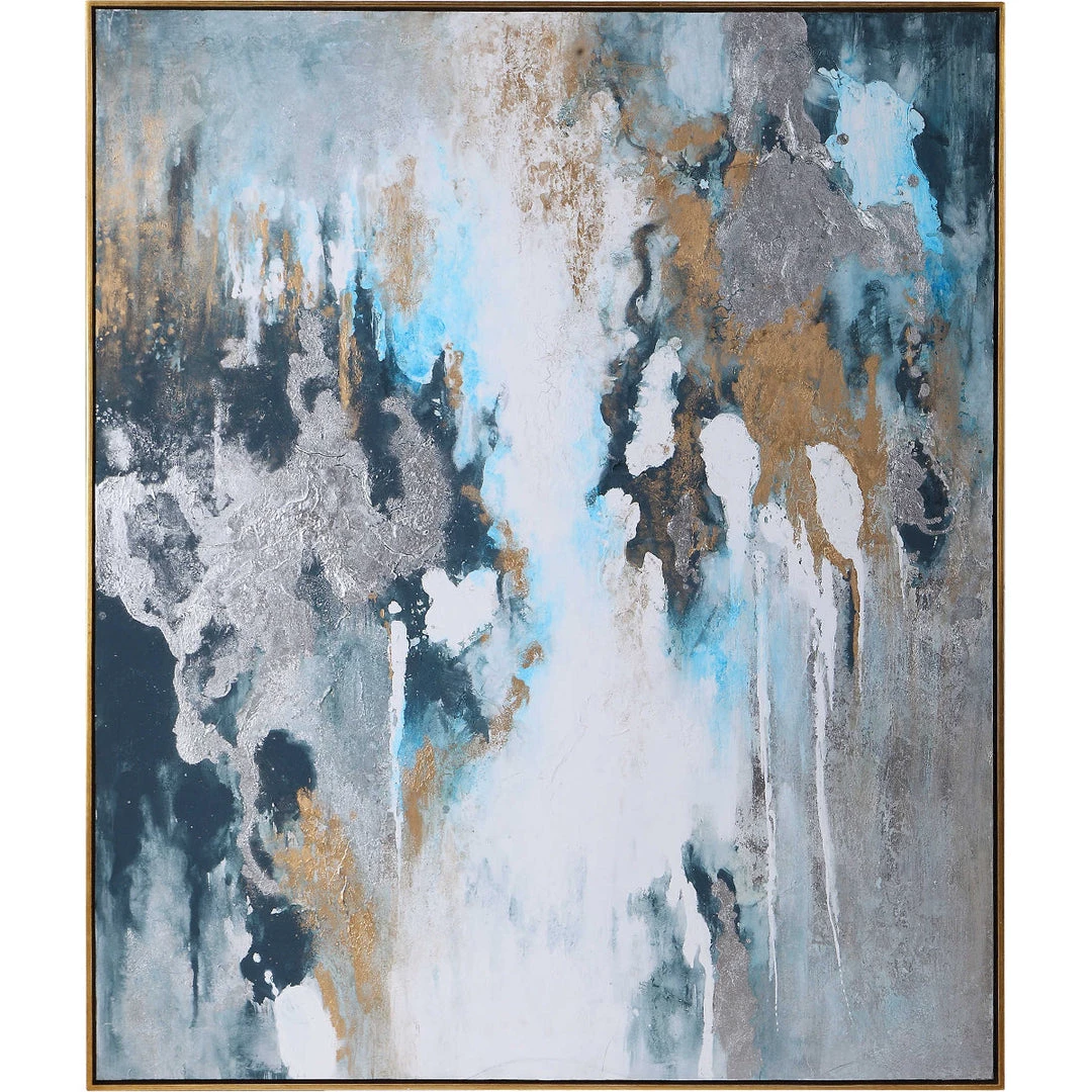 This hand painted abstract canvas artwork showcases large brush strokes and heavy texture. Dark teal and light blue shades are complimented by gold and silver leaf accents. Finished with a gold leaf gallery frame.