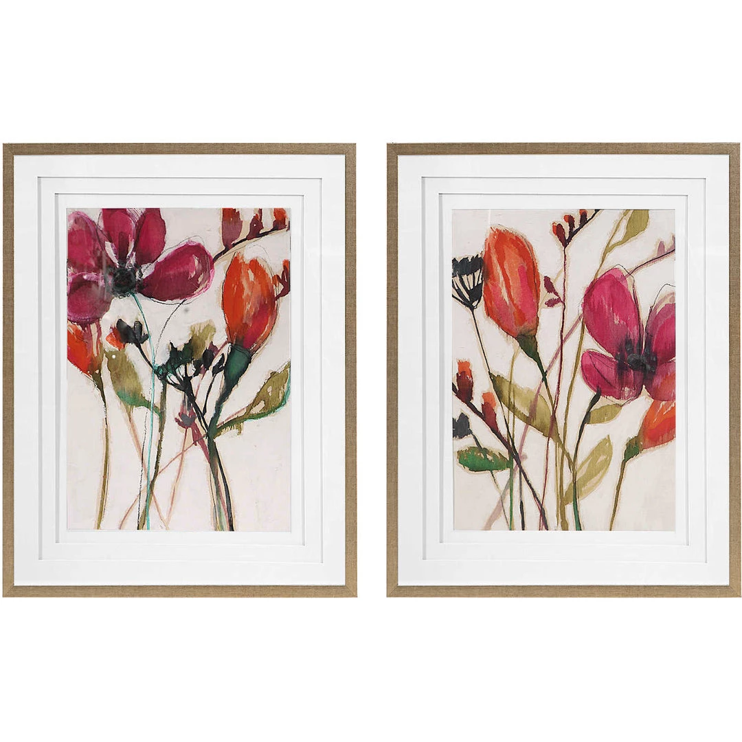 Elegant, feminine style emanates from these contemporary floral print artwork with vibrant shades of fuchsia, red-orange, emerald green, teal, and artichoke. Each print is triple matted in crisp, white floating mats and finished with antiqued champagne silver leaf frames. Each print is set under protective glass.