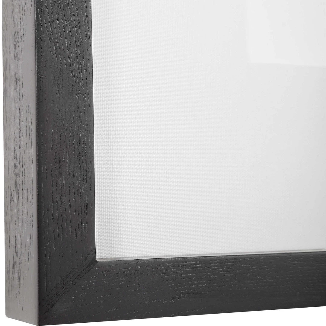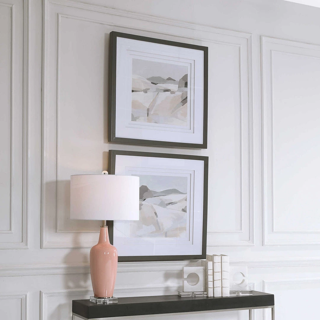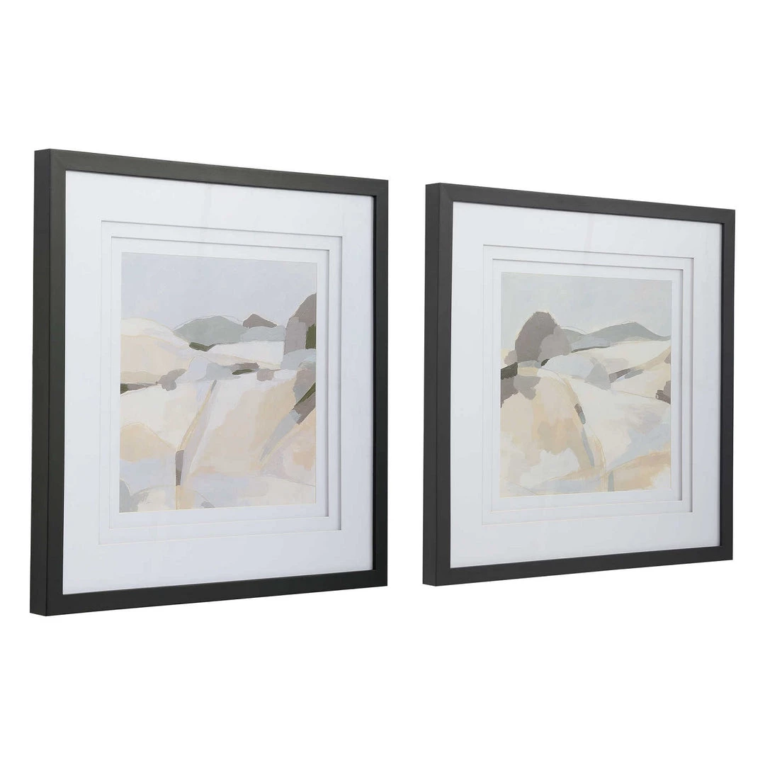 A modern interpretation of the Rocky Mountains, these framed prints showcase an array of neutral shades including taupe, brown, light gray, and white. Each print is accented by triple white matting with spacers and a sleek slate gray frame.
