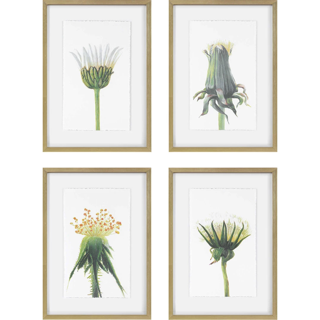 This set of framed artwork features printed wildflowers in sunny yellow, green, and white with orange accents and deckled edge details. Each print is accented by a crisp white background and a brushed gold frame under glass.