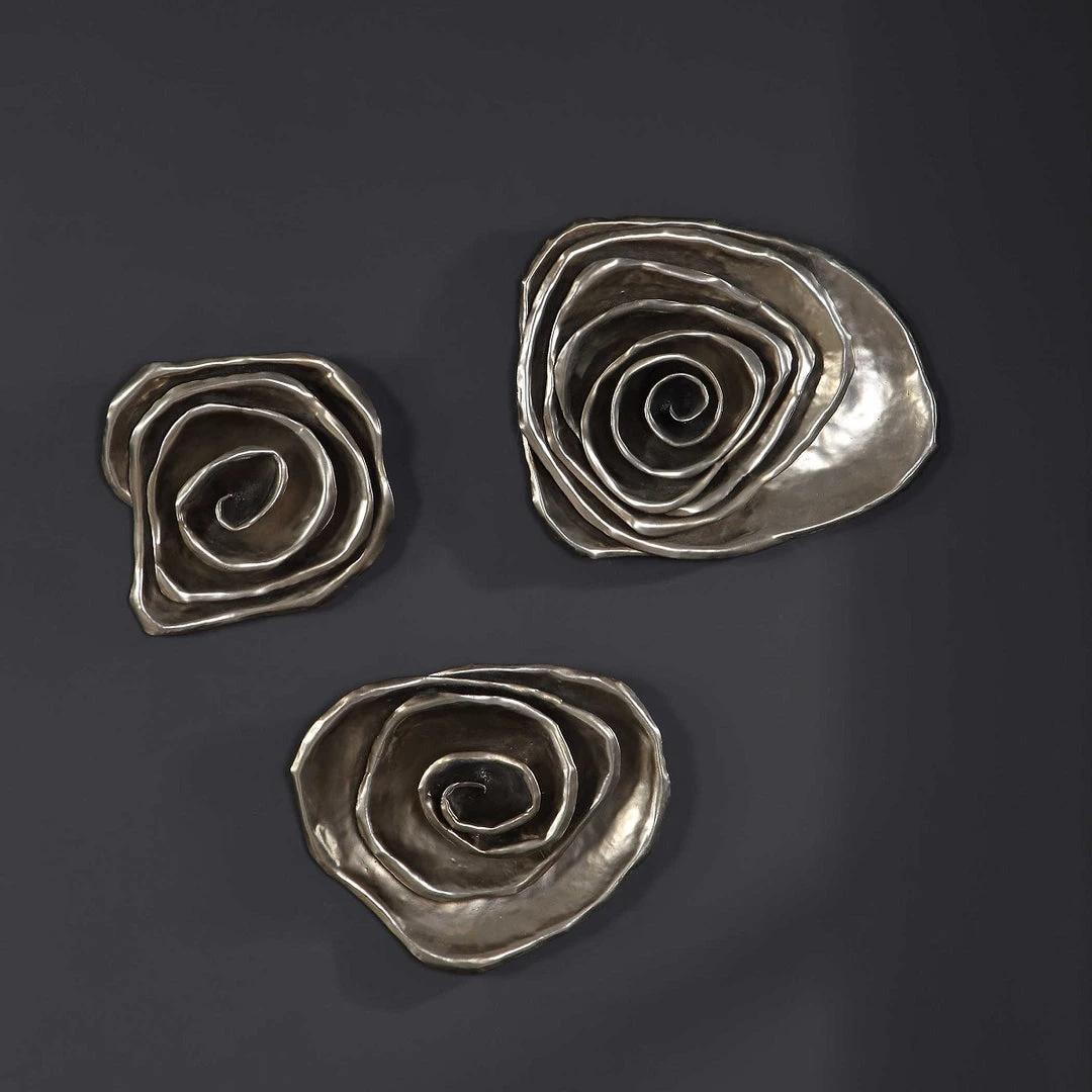 This set of 3 artful rose spirals are made of organically shaped hand forged iron and hand finished in a metallic burnished silver.