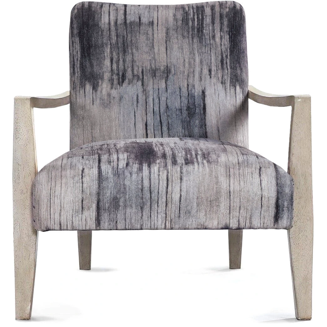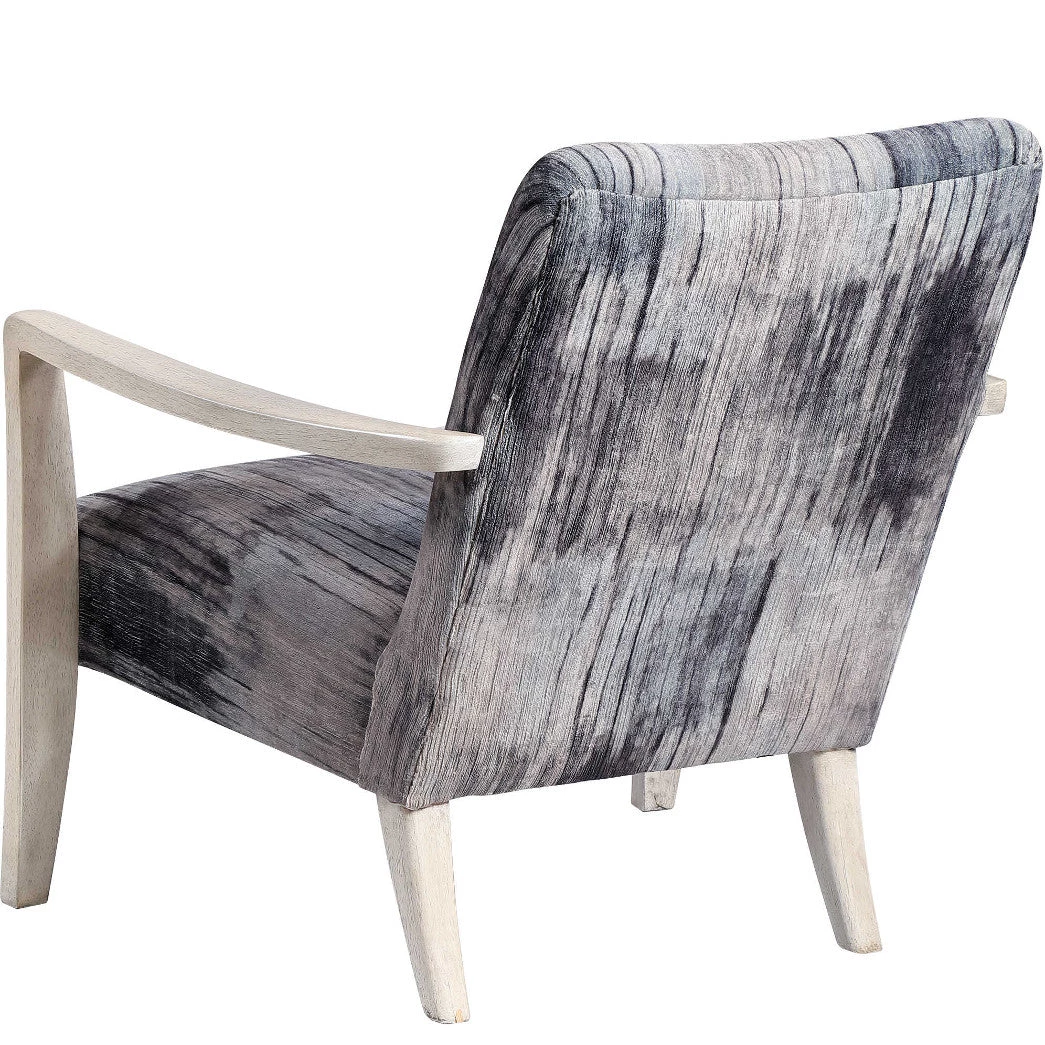 Reminiscent of tie dye, this statement accent chair features a unique abstract charcoal, gray and blue chenille fabric with a gently curved exposed solid wood frame in a natural off-white finish wire brushed details.