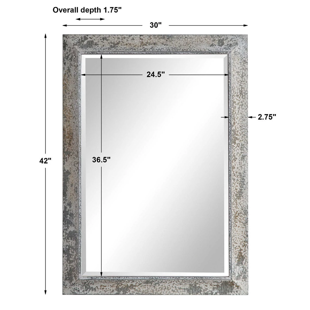 This mirror showcases a rustic casual style. The aged silver frame features an antique ivory wash with rust accents, heavy texture, and distressing. The mirror has a generous 1 1/4″ bevel