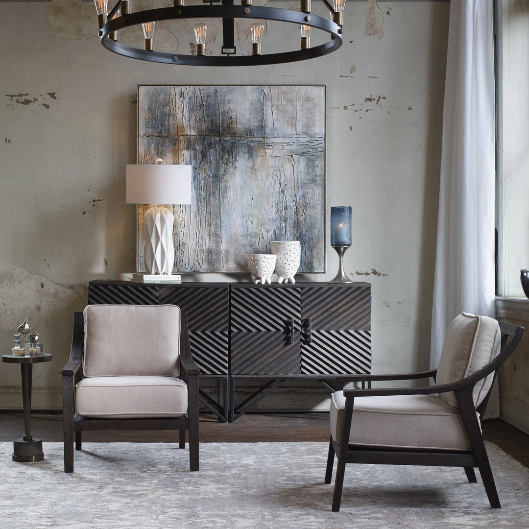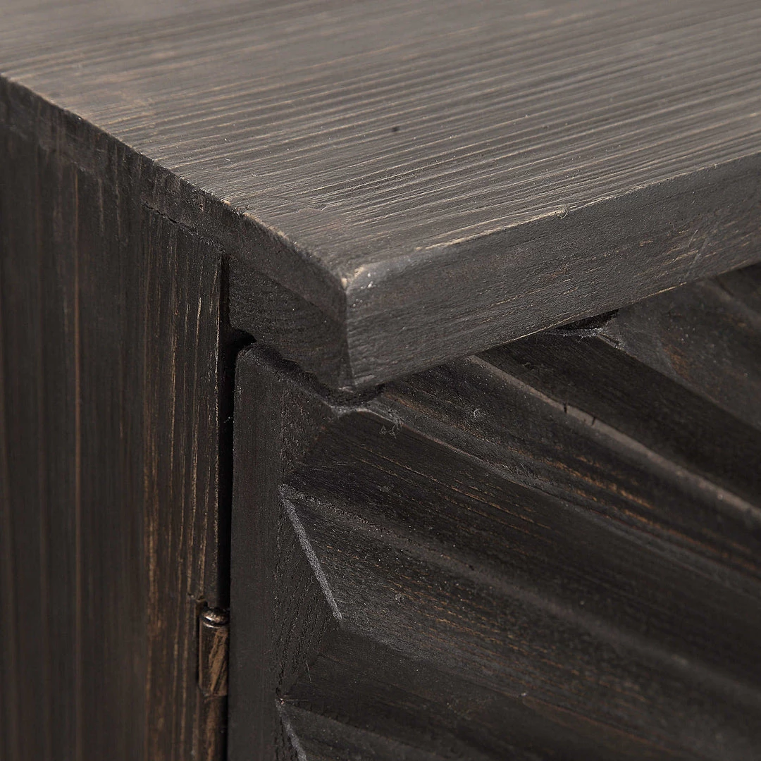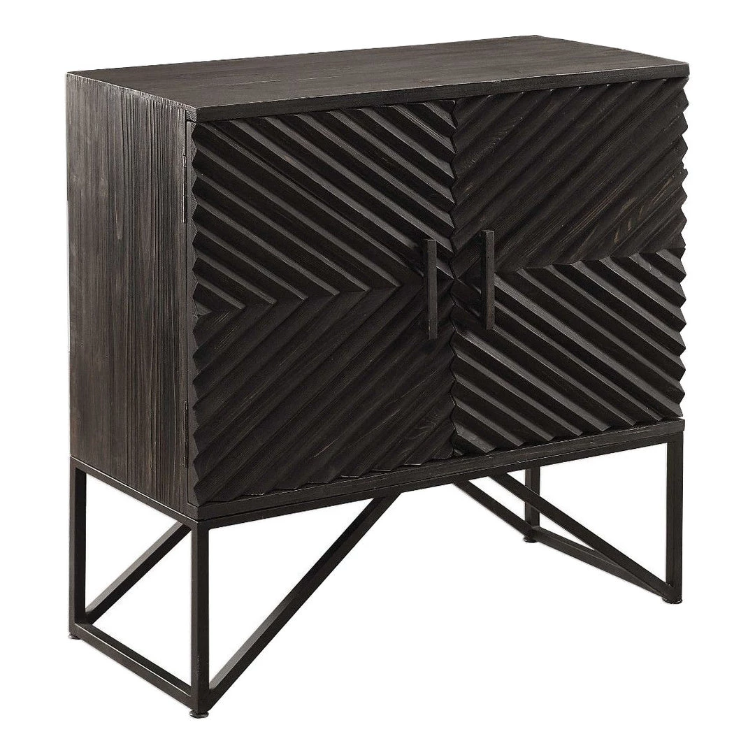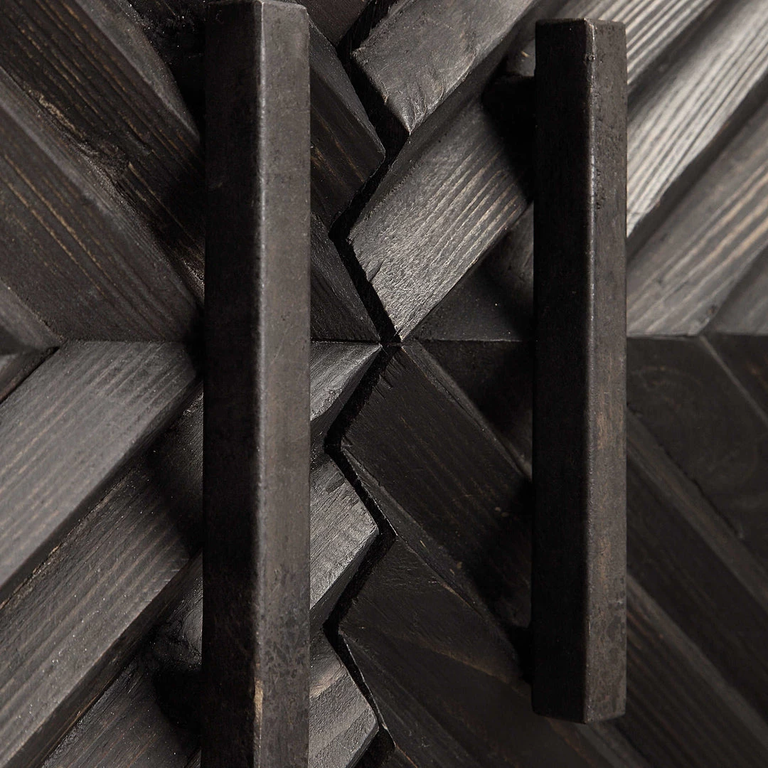 Intricately pieced with a modern 3-dimensional book matched chevron pattern in aged ebony finished fir wood, contrasting with a naturally finished rustic top. Supported by an iron base and accented with thick iron bar hardware finished in black steel. Has one fixed interior shelf.