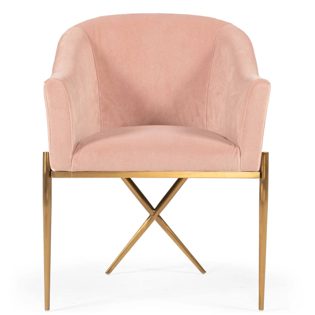 Elegance with edge. Matte gold-finished iron forms a linear foundation with an x-design back brings a fashion forward, femme look while plush velvet upholstered seating and curved silhouette gives a dose of modern sensibility.