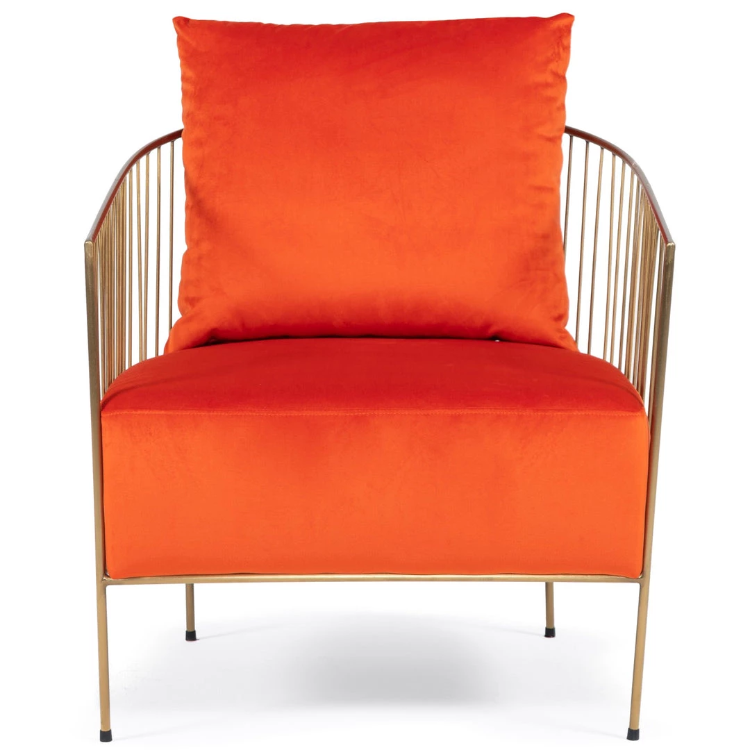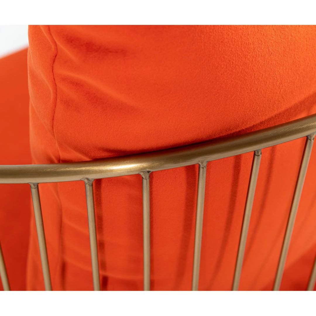 Channeling the iconic style of the 1960’s swinging London mod scene. Linear brushed gold-finished steel forms a barrel-style silhouette and punchy orange velvet seating gives a pop color for a fun, femme look.