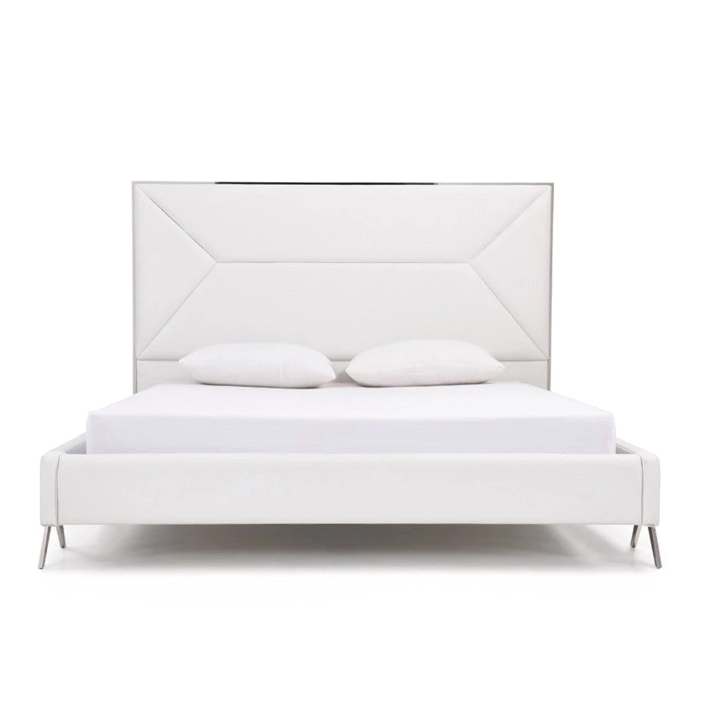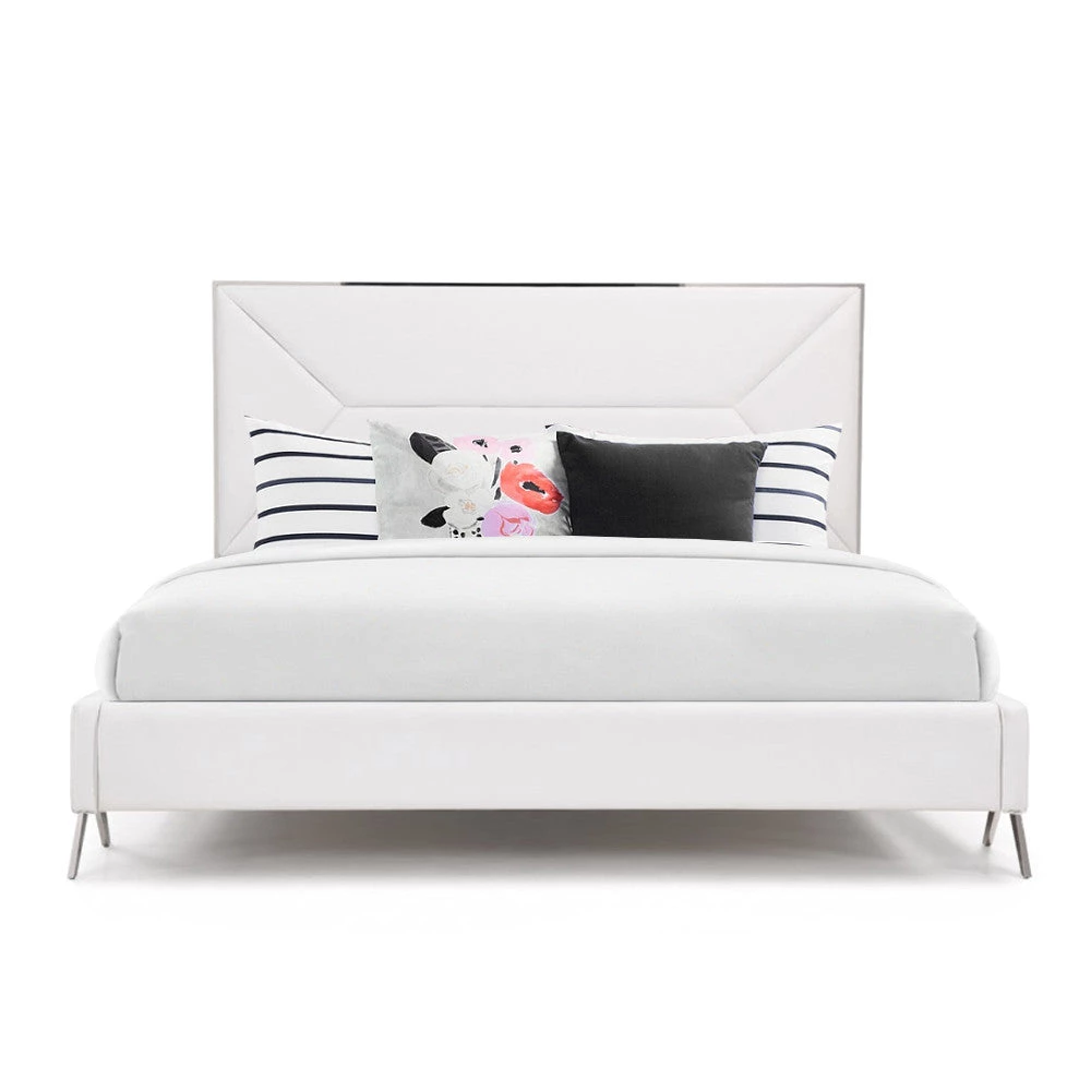 Upholstered in white leatherette, the headboard of the Lexi Bed has a stitched geometric design and a stainless steel border that goes all the way to the floor. The complimenting boomerang shaped legs finish off this modern minimalist bed design.