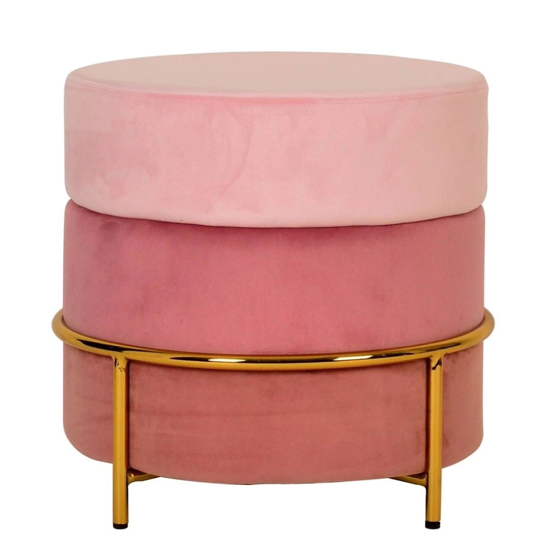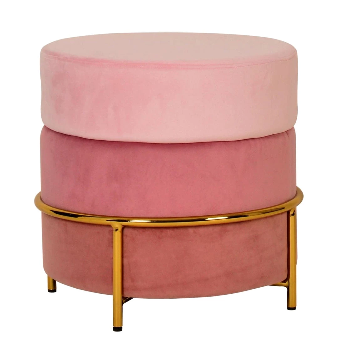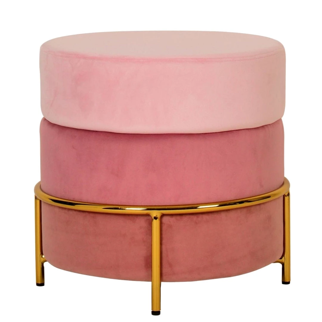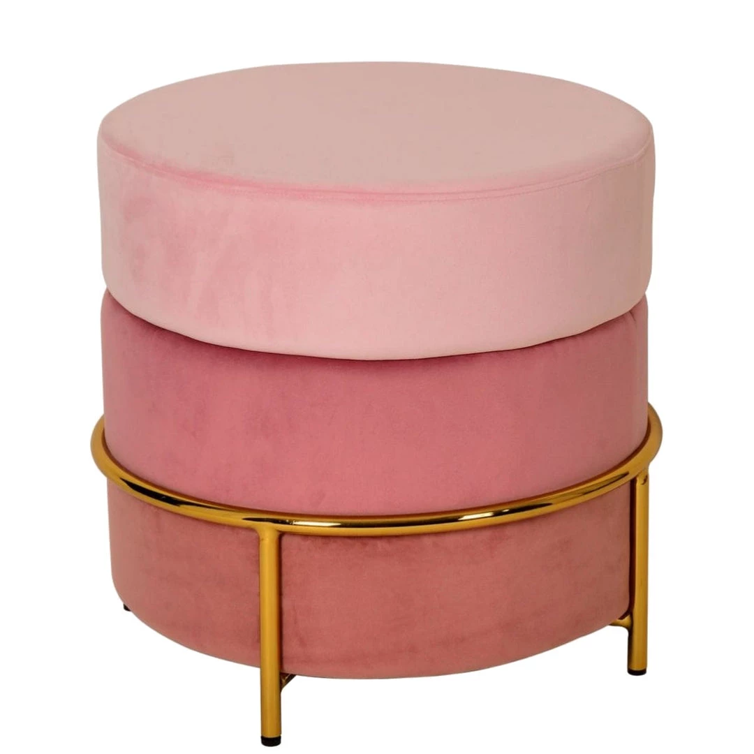 This petite ottoman is covered in hues of pink and coral velvet upholstery and set within a gold metal base.