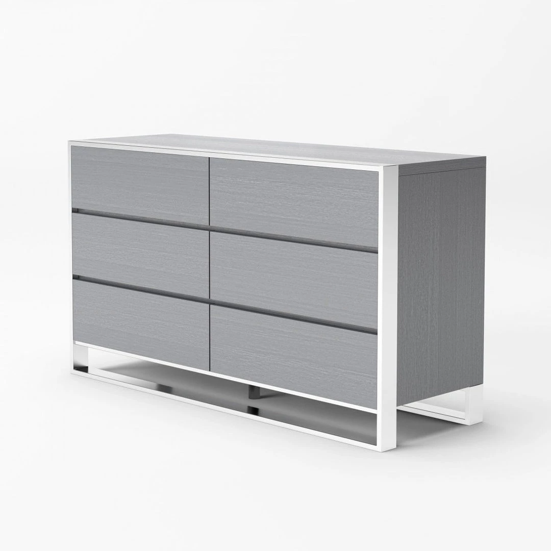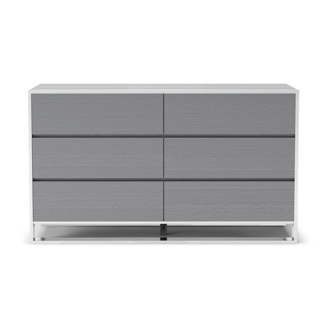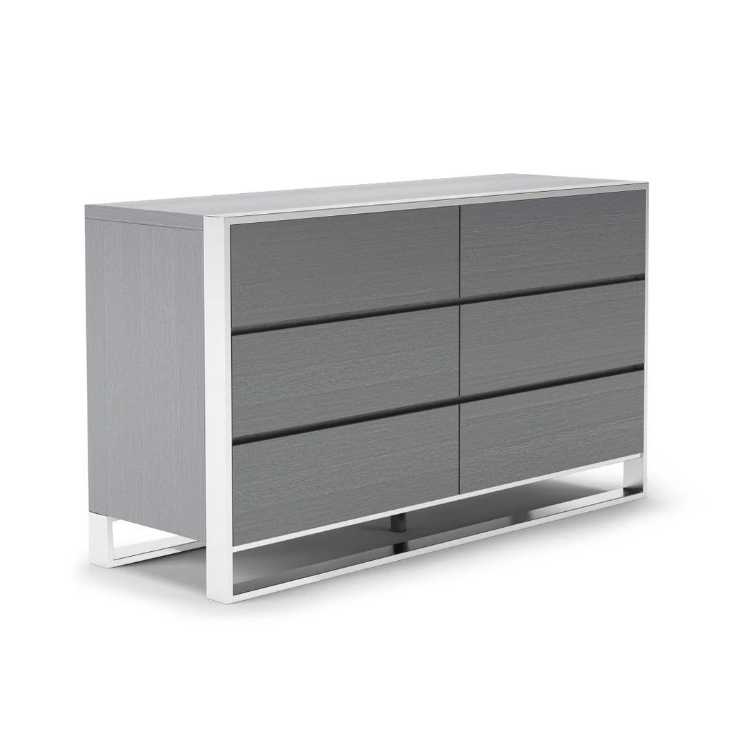 Finished in grey elm veneer, this six-drawer dresser is a great fit for the Modern Bedroom. From European soft-closing drawer glides to polished steel frame, this chest of drawers is both posh and practical.