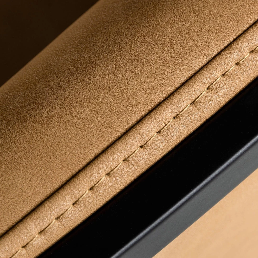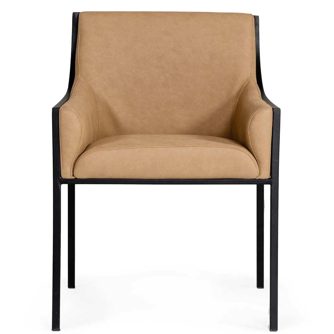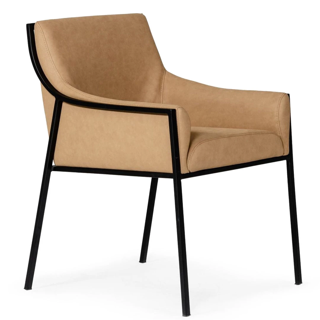 A modern staple. This simply contoured design exposed metal frame provides the perfect contrast to the versatile light tan vegan leather upholstery.