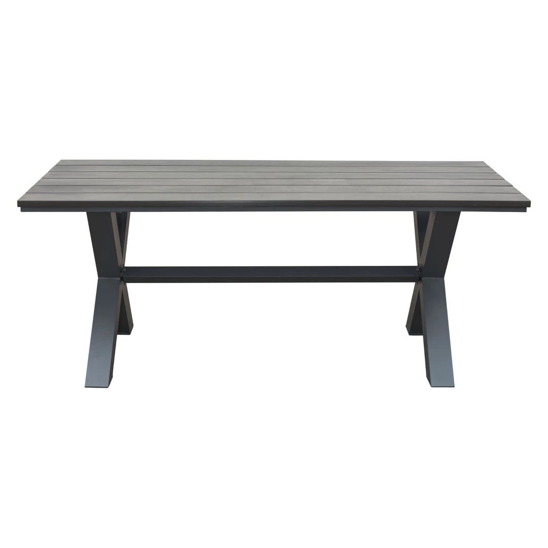 This industrial table with its classic X style base and plank style top is a great choice for casual outdoor dining. Made of weather-resistant faux wood in brown with a distressed grey wash overlay. Complete with natural grain texture its perfect for the great outdoors.
