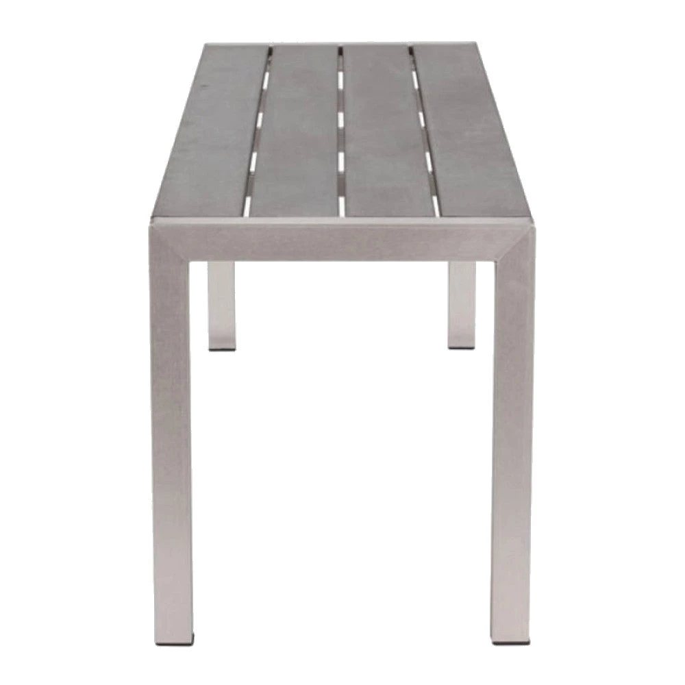 Clean and contemporary, the Minimalist Bench is a perfect seating option for modern dining. The frame is brushed aluminum and the top is polyurethane simulated wood.
